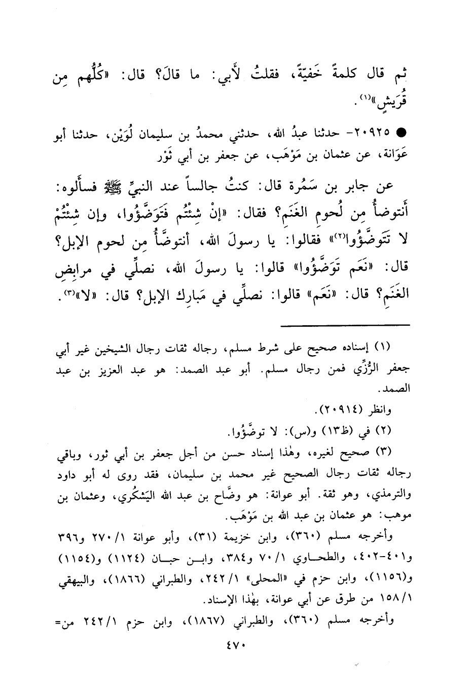 • ٢٠٩٢٥ - حَدَّثَنَا عَبْدُ اللهِ، حَدَّثَنِي مُحَمَّدُ بْنُ سُلَيْمَانَ لُوَيْنٌ، حَدَّثَنَا أَبُو عَوَانَةَ، عَنْ عُثْمَانَ بْنِ مَوْهَبٍ، عَنْ جَعْفَرِ بْنِ أَبِي ثَوْرٍ، عَنْ جَابِرِ بْنِ سَمُرَةَ، قَالَ: كُنْتُ جَالِسًا عِنْدَ النَّبِيِّ صَلَّى اللهُ عَلَيْهِ وَسَلَّمَ، فَسَأَلُوهُ أَنَتَوَضَّأُ مِنْ لُحُومِ الْغَنَمِ؟ فَقَالَ: " إِنْ شِئْتُمْ فَتَوَضَّئُوا، وَإِنْ شِئْتُمْ لَا تَتَوَضَّئُوا "، (٢) فَقَالُوا: يَا رَسُولَ اللهِ، أَنَتَوَضَّأُ مِنْ لُحُومِ الْإِبِلِ؟ قَالَ: " نَعَمْ " تَوَضَّئُوا " قَالُوا: يَا رَسُولَ اللهِ، نُصَلِّي فِي مَرَابِضِ الْغَنَمِ؟ قَالَ: " نَعَمْ "، قَالُوا: نُصَلِّي فِي مَبَارِكِ الْإِبِلِ؟ قَالَ: " لَا " (٣)