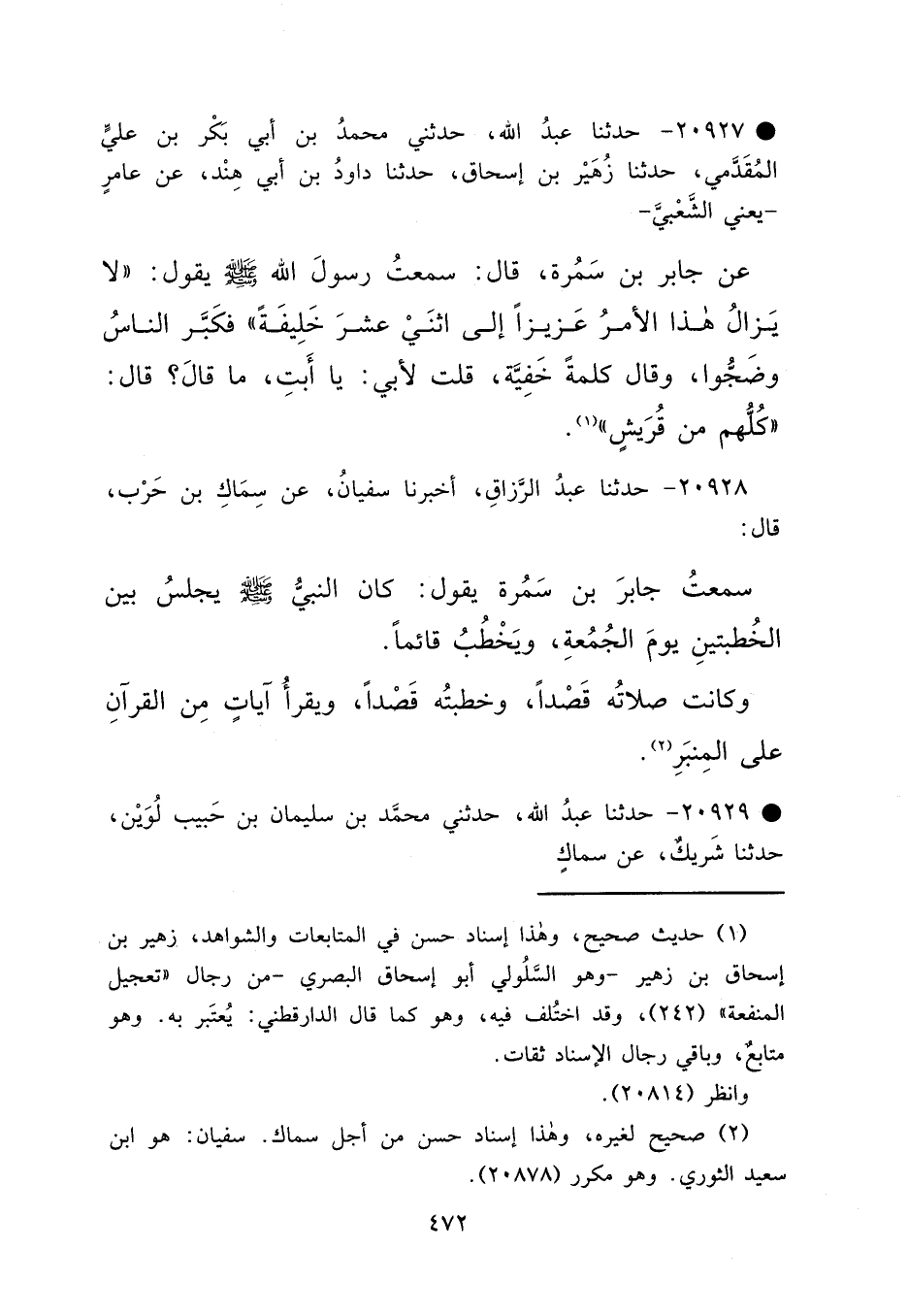 • ٢٠٩٢٧ - حَدَّثَنَا عَبْدُ اللهِ، حَدَّثَنِي مُحَمَّدُ بْنُ أَبِي بَكْرِ بْنِ عَلِيٍّ الْمُقَدَّمِيُّ، حَدَّثَنَا زُهَيْرُ بْنُ إِسْحَاقَ، حَدَّثَنَا دَاوُدُ بْنُ أَبِي هِنْدٍ، عَنْ عَامِرٍ يَعْنِي الشَّعْبِيَّ، عَنْ جَابِرِ بْنِ سَمُرَةَ، قَالَ: سَمِعْتُ رَسُولَ اللهِ صَلَّى اللهُ عَلَيْهِ وَسَلَّمَ يَقُولُ: " لَا يَزَالُ هَذَا الْأَمْرُ عَزِيزًا إِلَى اثْنَيْ عَشَرَ خَلِيفَةً "، فَكَبَّرَ النَّاسُ وَضَجُّوا، وَقَالَ كَلِمَةً خَفِيَّةً، قُلْتُ لِأَبِي: يَا أَبَتْ، مَا قَالَ؟ قَالَ: " كُلُّهُمْ مِنْ قُرَيْشٍ " (١)