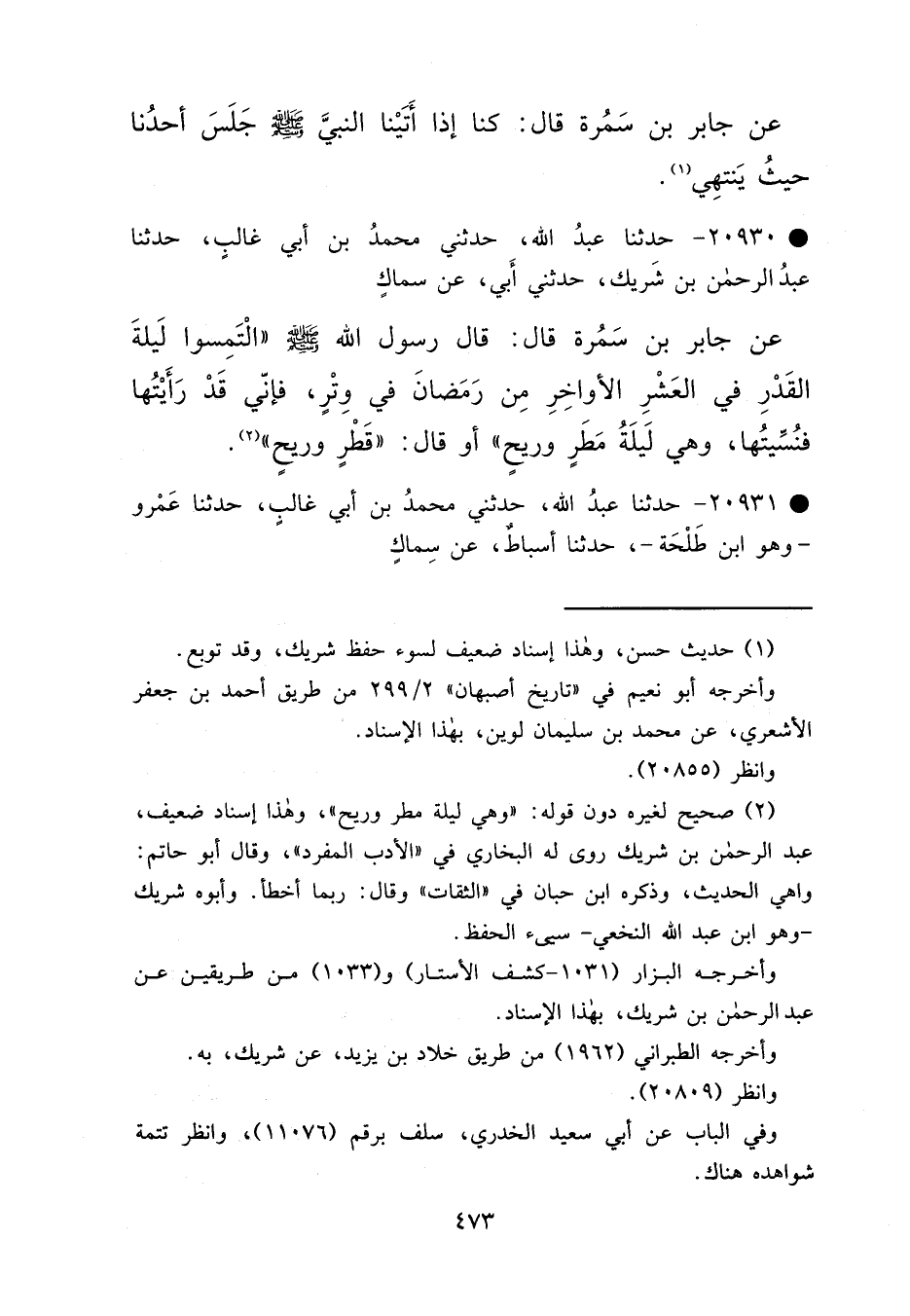 • ٢٠٩٣٠ - حَدَّثَنَا عَبْدُ اللهِ، حَدَّثَنِي مُحَمَّدُ بْنُ أَبِي غَالِبٍ، حَدَّثَنَا عَبْدُ الرَّحْمَنِ بْنُ شَرِيكٍ، حَدَّثَنِي أَبِي، عَنْ سِمَاكٍ، عَنْ جَابِرِ بْنِ سَمُرَةَ، قَالَ: قَالَ رَسُولُ اللهِ صَلَّى اللهُ عَلَيْهِ وَسَلَّمَ: " الْتَمِسُوا لَيْلَةَ الْقَدْرِ فِي الْعَشْرِ الْأَوَاخِرِ مِنْ رَمَضَانَ، فِي وَتْرٍ، فَإِنِّي قَدْ رَأَيْتُهَا فَنُسِّيتُهَا، هِيَ لَيْلَةُ مَطَرٍ وَرِيحٍ "، أَوْ قَالَ: " قَطْرٍ وَرِيحٍ " (٢)