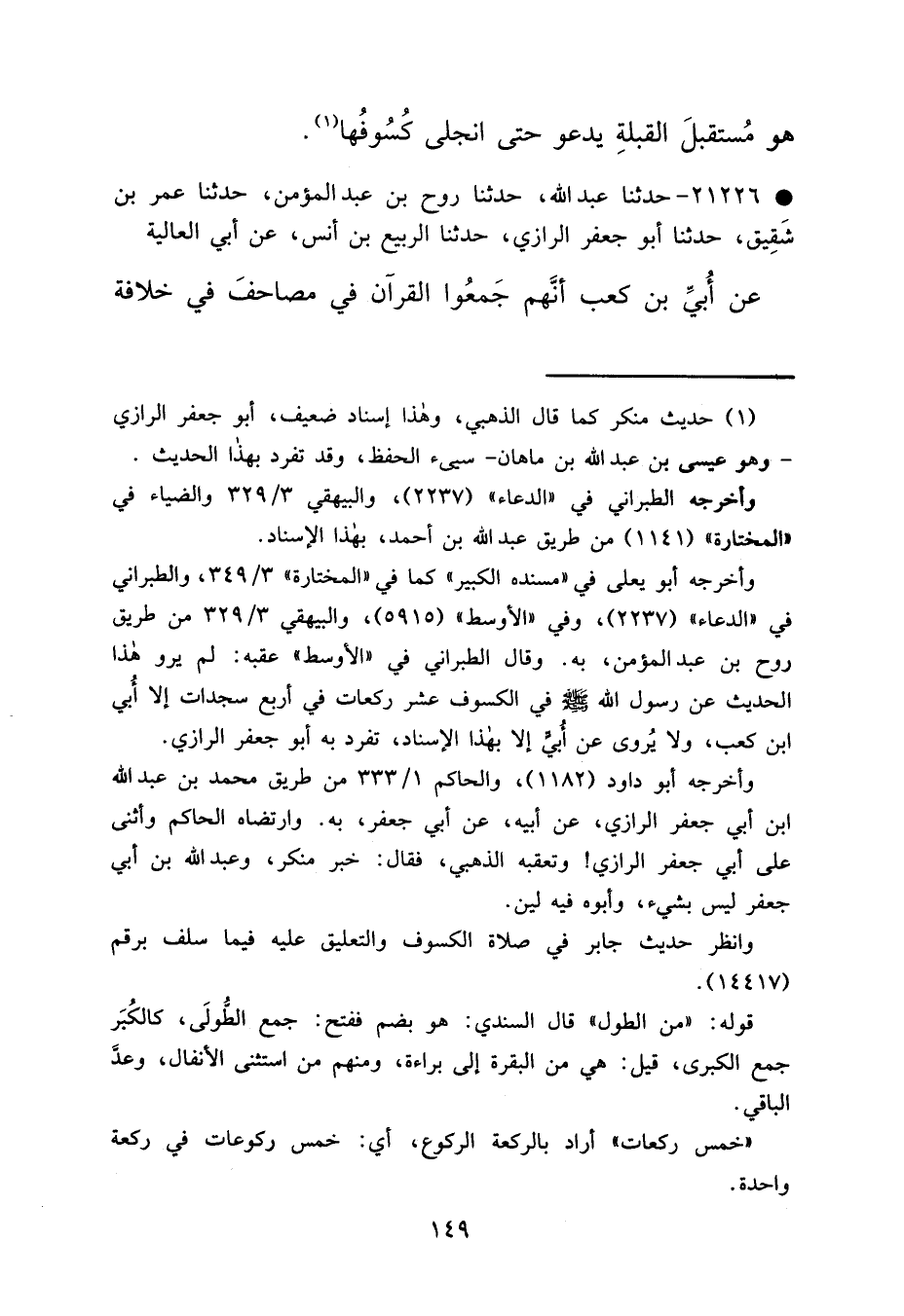 وأخرجه أبو يعلى في "مسنده الكبير" كما في "المختارة" ٣/٣٤٩، والطبراني في "الدعاء" (٢٢٣٧) ، وفي "الأوسط" (٥٩١٥) ، والبيهقي ٣/٣٢٩ من طريق روح بن عبد المؤمن، به. وقال الطبراني في "الأوسط" عقبه: لم يرو هذا الحديث عن رسول الله صَلَّى اللهُ عَلَيْهِ وَسَلَّمَ في الكسوف عشر ركعات في أربع سجدات إلا أُبيّ ابن كعب، ولا يُروى عن أُبيِّ إلا بهذا الإسناد، تفرد به أبو جعفر الرازي.