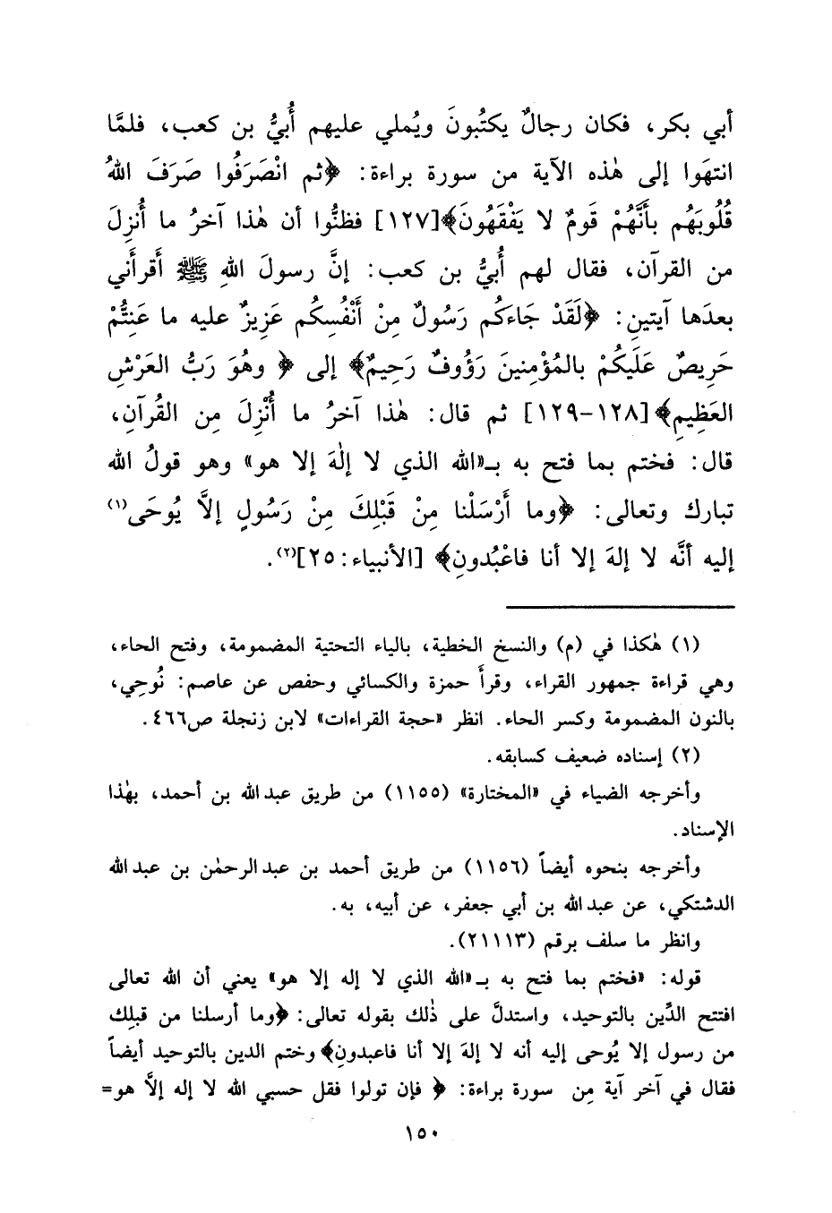 أَبِي بَكْرٍ، فَكَانَ رِجَالٌ يَكْتُبُونَ وَيُمْلِي عَلَيْهِمْ أُبَيُّ بْنُ كَعْبٍ، فَلَمَّا انْتَهَوْا إِلَى هَذِهِ الْآيَةِ مِنْ سُورَةِ بَرَاءَةٌ: {ثُمَّ انْصَرَفُوا صَرَفَ اللهُ قُلُوبَهُمْ بِأَنَّهُمْ قَوْمٌ لَا يَفْقَهُونَ} [التوبة: ١٢٧] ، فَظَنُّوا أَنَّ هَذَا آخِرُ مَا أُنْزِلَ مِنَ الْقُرْآنِ، فَقَالَ لَهُمْ أُبَيُّ بْنُ كَعْبٍ: "إِنَّ رَسُولَ اللهِ صَلَّى اللهُ عَلَيْهِ وَسَلَّمَ أَقْرَأَنِي بَعْدَهَا آيَتَيْنِ: {لَقَدْ جَاءَكُمْ رَسُولٌ مِنْ أَنْفُسِكُمْ عَزِيزٌ عَلَيْهِ مَا عَنِتُّمْ حَرِيصٌ عَلَيْكُمْ بِالْمُؤْمِنِينَ رَءُوفٌ رَحِيمٌ} ، إِلَى، {وَهُوَ رَبُّ الْعَرْشِ الْعَظِيمِ} [التوبة: ١٢٩] " ثُمَّ قَالَ: "هَذَا آخِرُ مَا أُنْزِلَ مِنَ الْقُرْآنِ، قَالَ: فَخُتِمَ بِمَا فُتِحَ بِهِ، بِاللهِ الَّذِي لَا إِلَهَ إِلَّا هُوَ، وَهُوَ قَوْلُ اللهِ تَبَارَكَ وَتَعَالَى: (وَمَا أَرْسَلْنَا مِنْ قَبْلِكَ مِنْ رَسُولٍ إِلَّا يُوحَى (١) إِلَيْهِ أَنَّهُ لَا إِلَهَ إِلَّا أَنَا فَاعْبُدُونِ) " [الأنبياء: ٢٥] (٢)