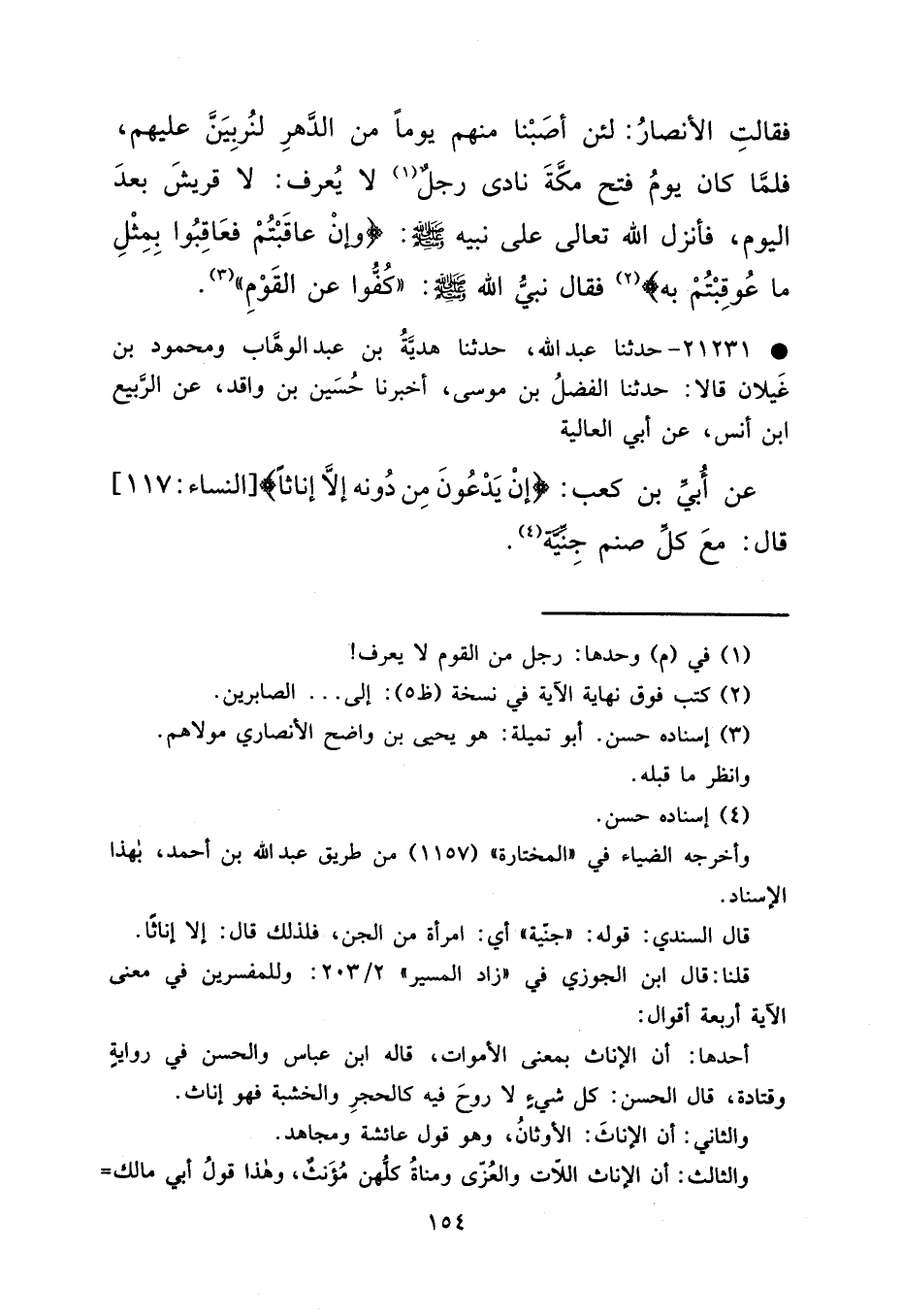 • ٢١٢٣١ - حَدَّثَنَا عَبْدُ اللهِ، حَدَّثَنَا هَدِيَّةُ بْنُ عَبْدِ الْوَهَّابِ، وَمَحْمُودُ بْنُ غَيْلَانَ، قَالَا: حَدَّثَنَا الْفَضْلُ بْنُ مُوسَى، أَخْبَرَنَا حُسَيْنُ بْنُ وَاقِدٍ، عَنْ الرَّبِيعِ بْنِ أَنَسٍ، عَنْ أَبِي الْعَالِيَةِ، عَنْ أُبَيِّ بْنِ كَعْبٍ: {إِنْ يَدْعُونَ مِنْ دُونِهِ إِلَّا إِنَاثًا} [النساء: ١١٧] قَالَ: "مَعَ كُلِّ صَنَمٍ جِنِّيَّةٌ " (٤)