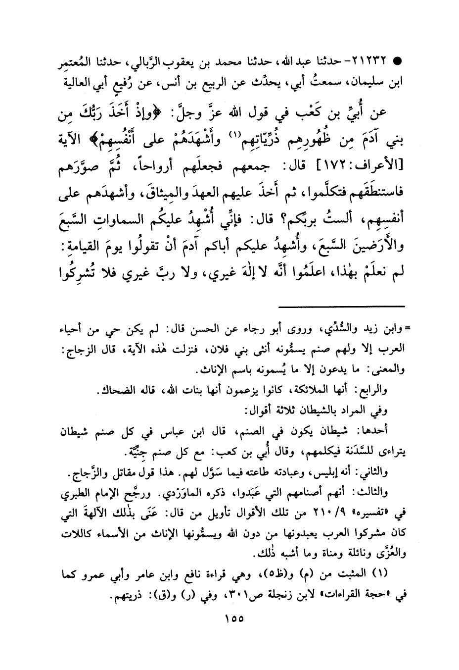 • ٢١٢٣٢ - حَدَّثَنَا عَبْدُ اللهِ، حَدَّثَنَا مُحَمَّدُ بْنُ يَعْقُوبَ الرَّبَالِيُّ، حَدَّثَنَا الْمُعْتَمِرُ بْنُ سُلَيْمَانَ، سَمِعْتُ أَبِي، يُحَدِّثُ عَنْ الرَّبِيعِ بْنِ أَنَسٍ، عَنْ رُفَيْعٍ أَبِي الْعَالِيَةِ، عَنْ أُبَيِّ بْنِ كَعْبٍ، فِي قَوْلِ اللهِ عَزَّ وَجَلَّ: (وَإِذْ أَخَذَ رَبُّكَ مِنْ بَنِي آدَمَ مِنْ ظُهُورِهِمْ ذُرِّيَّاتِهِمْ (١) وَأَشْهَدَهُمْ عَلَى أَنْفُسِهِمُ) الْآيَةَ [الأعراف: ١٧٢] ، قَالَ: "جَمَعَهُمْ فَجَعَلَهُمْ أَرْوَاحًا، ثُمَّ صَوَّرَهُمْ فَاسْتَنْطَقَهُمْ فَتَكَلَّمُوا، ثُمَّ أَخَذَ عَلَيْهِمُ الْعَهْدَ وَالْمِيثَاقَ، وَأَشْهَدَهُمْ عَلَى أَنْفُسِهِمْ، أَلَسْتُ بِرَبِّكُمْ؟ قَالَ: فَإِنِّي أُشْهِدُ عَلَيْكُمُ السَّمَاوَاتِ السَّبْعَ وَالْأَرَضِينَ السَّبْعَ، وَأُشْهِدُ عَلَيْكُمْ أَبَاكُمْ آدَمَ أَنْ تَقُولُوا يَوْمَ الْقِيَامَةِ: لَمْ نَعْلَمْ بِهَذَا، اعْلَمُوا أَنَّهُ لَا إِلَهَ غَيْرِي، وَلَا رَبَّ غَيْرِي فَلَا تُشْرِكُوا