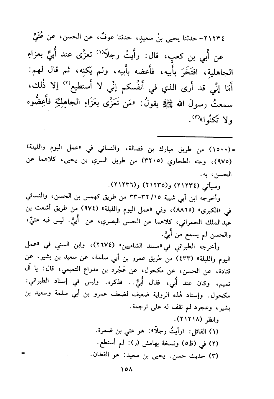 ٢١٢٣٤ - حَدَّثَنَا يَحْيَى بْنُ سَعِيدٍ، حَدَّثَنَا عَوْفٌ، عَنْ الْحَسَنِ، عَنْ عُتَيٍّ، عَنْ أُبَيِّ بْنِ كَعْبٍ، قَالَ: رَأَيْتُ رَجُلًا (١) تَعَزَّى عِنْدَ أُبَيٍّ بِعَزَاءِ الْجَاهِلِيَّةِ، افْتَخَرَ بِأَبِيهِ، فَأَعَضَّهُ بِأَبِيهِ، وَلَمْ يُكَنِّهِ، ثُمَّ قَالَ لَهُمْ: أَمَا إِنِّي قَدْ أَرَى الَّذِي فِي أَنْفُسِكُمْ إِنِّي لَا أَسْتَطِيعُ (٢) إِلَّا ذَلِكَ، سَمِعْتُ رَسُولَ اللهِ صَلَّى اللهُ عَلَيْهِ وَسَلَّمَ يَقُولُ: "مَنْ تَعَزَّى بِعَزَاءِ الْجَاهِلِيَّةِ، فَأَعِضُّوهُ، وَلَا تَكْنُوا " (٣)