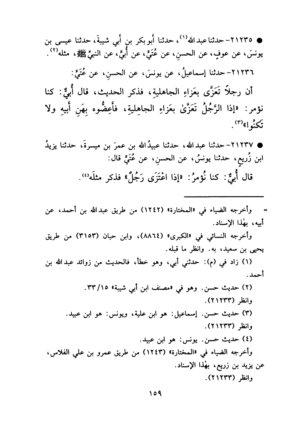 • ٢١٢٣٧ - حَدَّثَنَا عَبْدُ اللهِ، حَدَّثَنَا عُبَيْدُ اللهِ بْنُ عُمَرَ بْنِ مَيْسَرَةَ، حَدَّثَنَا يَزِيدُ بْنُ زُرَيْعٍ، حَدَّثَنَا يُونُسُ، عَنْ الْحَسَنِ، عَنْ عُتَيٍّ، قَالَ: قَالَ أُبَيٌّ: كُنَّا نُؤْمَرُ: "إِذَا اعْتَزَى رَجُلٌ " فَذَكَرَ مِثْلَهُ (٤)
