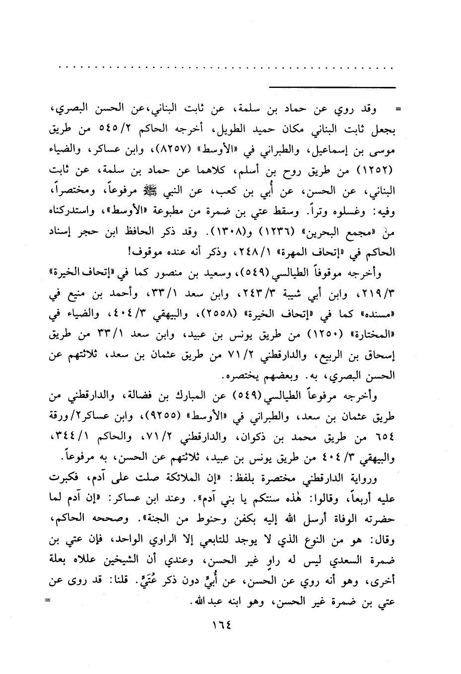 ورواية الدارقطني مختصرة بلفظ: "إن الملائكة صلت على آدم، فكبرت عليه أربعاً، وقالوا: هذه سنتكم يا بني آدم". وعند ابن عساكر: "إن آدم لما حضرته الوفاة أرسل الله إليه بكفن وحنوط من الجنة". وصححه الحاكم، وقال: هو من النوع الذي لا يوجد للتابعي إلا الراوي الواحد، فإن عتي بن ضمرة السعدي ليس له راوٍ غير الحسن، وعندي أن الشيخين عللاه بعلة أخرى، وهو أنه روي عن الحسن، عن أُبيِّ دون ذكر عُتَيِّ. قلنا: قد روى عن عتي بن ضمرة غير الحسن، وهو ابنه عبد الله.=
