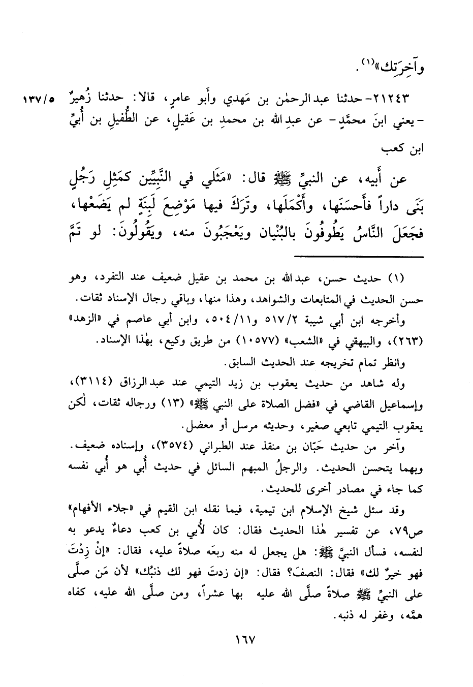 ٢١٢٤٣ - حَدَّثَنَا عَبْدُ الرَّحْمَنِ بْنُ مَهْدِيٍّ، وَأَبُو عَامِرٍ، قَالَا: حَدَّثَنَا زُهَيْرٌ يَعْنِي ابْنَ مُحَمَّدٍ، عَنْ عَبْدِ اللهِ بْنِ مُحَمَّدِ بْنِ عَقِيلٍ، عَنْ الطُّفَيْلِ بْنِ أُبَيِّ بْنِ كَعْبٍ، عَنْ أَبِيهِ، عَنِ النَّبِيِّ صَلَّى اللهُ عَلَيْهِ وَسَلَّمَ قَالَ: "مَثَلِي فِي النَّبِيِّينَ كَمَثَلِ رَجُلٍ بَنَى دَارًا فَأَحْسَنَهَا، وَأَكْمَلَهَا، وَتَرَكَ فِيهَا مَوْضِعَ لَبِنَةٍ لَمْ يَضَعْهَا، فَجَعَلَ النَّاسُ يَطُوفُونَ بِالْبُنْيَانِ وَيَعْجَبُونَ مِنْهُ، وَيَقُولُونَ: لَوْ تَمَّ