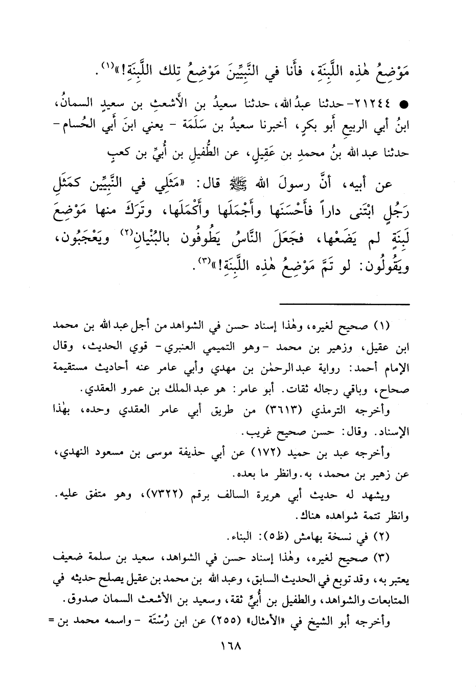 • ٢١٢٤٤ - حَدَّثَنَا عَبْدُ اللهِ حَدَّثَنَا سَعِيدُ بْنُ الْأَشْعَثِ بْنِ سَعِيدٍ السَّمَّانُ ابْنُ أَبِي الرَّبِيعِ، أَخْبَرَنَا سَعِيدُ بْنُ سَلَمَةَ يَعْنِي ابْنَ أَبِي الْحُسَامِ، حَدَّثَنَا عَبْدُ اللهِ بْنُ مُحَمَّدِ بْنِ عَقِيلٍ، عَنِ الطُّفَيْلِ بْنِ أُبَيِّ بْنِ كَعْبٍ، عَنْ أَبِيهِ، أَنَّ رَسُولَ اللهِ صَلَّى اللهُ عَلَيْهِ وَسَلَّمَ قَالَ: "" مَثَلِي فِي النَّبِيِّينَ كَمَثَلِ رَجُلٍ ابْتَنَى دَارًا فَأَحْسَنَهَا وَأَجْمَلَهَا وَأَكْلَمَهَا، وَتَرَكَ مِنْهَا مَوْضِعَ لَبِنَةٍ لَمْ يَضَعْهَا، فَجَعَلَ النَّاسُ يَطُوفُونَ بِالْبُنْيَانِ، (٢) وَيَعْجَبُونَ، وَيَقُولُونَ: لَوْ تَمَّ مَوْضِعُ هَذِهِ اللَّبِنَةِ " " (٣)