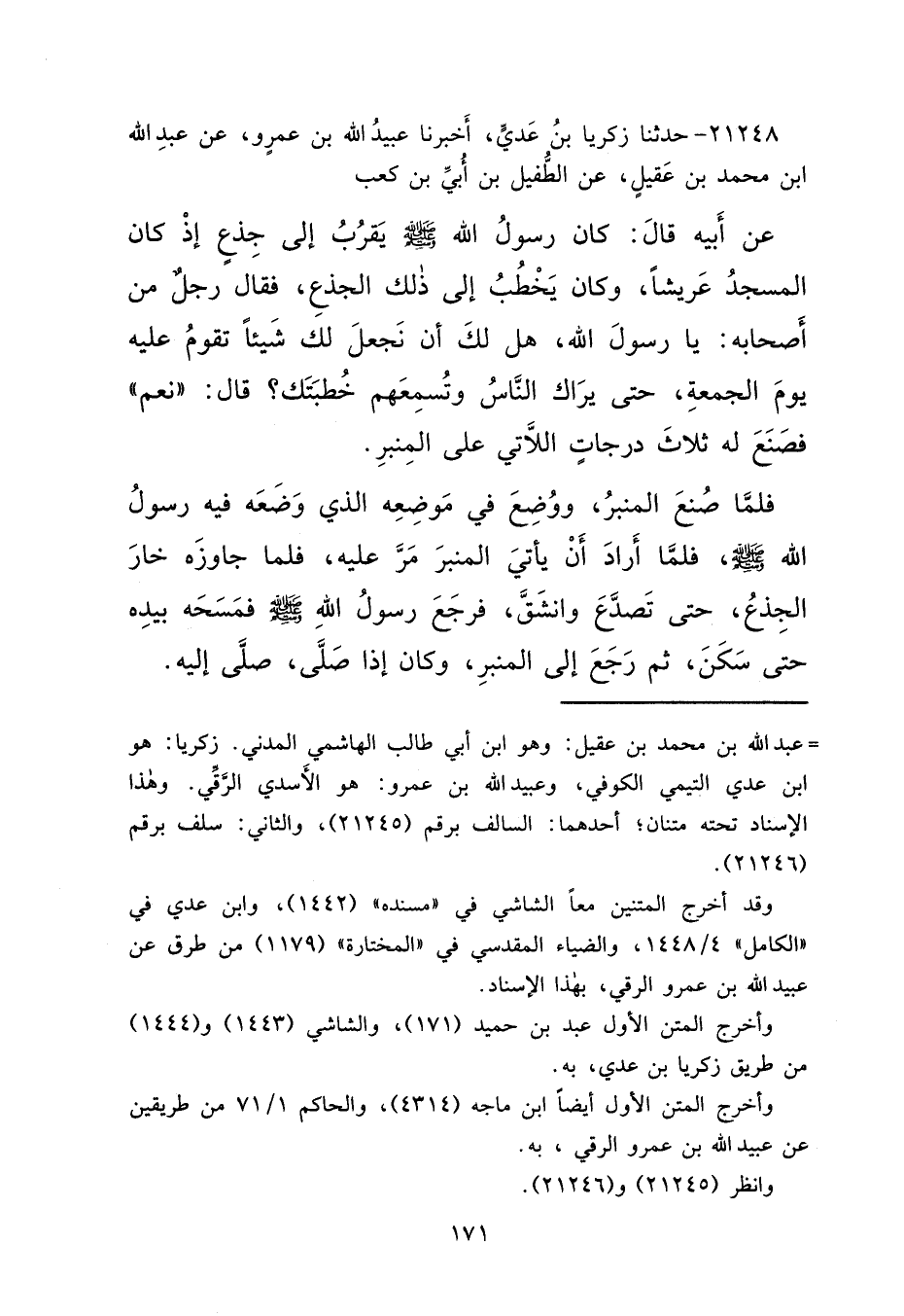 ٢١٢٤٨ - حَدَّثَنَا زَكَرِيَّا بْنُ عَدِيٍّ، أَخْبَرَنَا عُبَيْدُ اللهِ بْنُ عَمْرٍو، عَنْ عَبْدِ اللهِ بْنِ مُحَمَّدِ بْنِ عَقِيلٍ، عَنْ الطُّفَيْلِ بْنِ أُبَيِّ بْنِ كَعْبٍ، عَنْ أَبِيهِ، قَالَ: كَانَ رَسُولُ اللهِ صَلَّى اللهُ عَلَيْهِ وَسَلَّمَ يَقْرُبُ إِلَى جِذْعٍ إِذْ كَانَ الْمَسْجِدُ عَرِيشًا، وَكَانَ يَخْطُبُ إِلَى ذَلِكَ الْجِذْعِ، فَقَالَ رَجُلٌ مِنْ أَصْحَابِهِ: يَا رَسُولَ اللهِ، هَلْ لَكَ أَنْ تَجْعَلَ لَكَ شَيْئًا تَقُومُ عَلَيْهِ يَوْمَ الْجُمُعَةِ، حَتَّى يَرَاكَ النَّاسُ وَتُسْمِعَهُمْ خُطْبَتَكَ؟ قَالَ: "نَعَمْ " فَصُنِعَ لَهُ ثَلَاثُ دَرَجَاتٍ اللَّاتِي عَلَى الْمِنْبَرِ. فَلَمَّا صُنِعَ الْمِنْبَرُ، وَوُضِعَ فِي مَوْضِعِهِ الَّذِي وَضَعَهُ فِيهِ رَسُولُ اللهِ صَلَّى اللهُ عَلَيْهِ وَسَلَّمَ، " فَلَمَّا أَرَادَ أَنْ يَأْتِيَ الْمِنْبَرَ مَرَّ عَلَيْهِ، فَلَمَّا جَاوَزَهُ خَارَ الْجِذْعُ، حَتَّى تَصَدَّعَ وَانْشَقَّ، فَرَجَعَ رَسُولُ اللهِ صَلَّى اللهُ عَلَيْهِ وَسَلَّمَ فَمَسَحَهُ بِيَدِهِ حَتَّى سَكَنَ، ثُمَّ رَجَعَ إِلَى الْمِنْبَرِ، وَكَانَ إِذَا صَلَّى، صَلَّى إِلَيْهِ " "