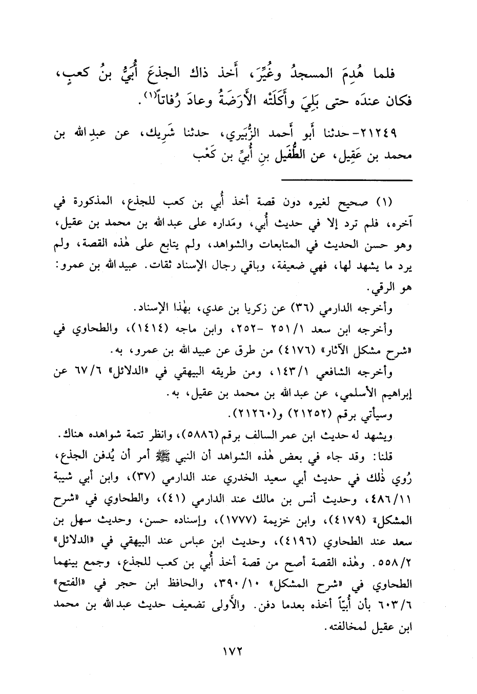 قلنا: وقد جاء في بعض هذه الشواهد أن النبي صَلَّى اللهُ عَلَيْهِ وَسَلَّمَ أمر أن يُدفن الجذع، رُوي ذلك في حديث أبي سعيد الخدري عند الدارمي (٣٧) ، وابن أبي شيبة ١١/٤٨٦، وحديث أنس بن مالك عند الدارمي (٤١) ، والطحاوي في "شرح المشكل" (٤١٧٩) ، وابن خزيمة (١٧٧٧) ، وإسناده حسن، وحديث سهل بن سعد عند الطحاوي (٤١٩٦) ، وحديث ابن عباس عند البيهقي في "الدلائل" ٢/٥٥٨. وهذه القصة أصح من قصة أخذ أُبي بن كعب للجذع، وجمع بينهما الطحاوي في "شرح المشكل" ١٠/٣٩٠، والحافظ ابن حجر في "الفتح" ٦/٦٠٣ بأن أُبيّاً أخذه بعدما دفن. والأَولى تضعيف حديث عبد الله بن محمد ابن عقيل لمخالفته.