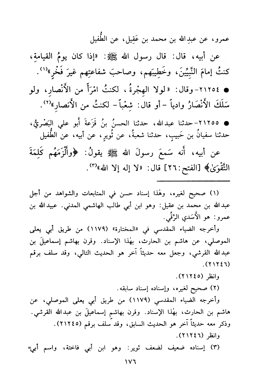 عَمْرٍو، عَنْ عَبْدِ اللهِ بْنِ مُحَمَّدِ بْنِ عَقِيلٍ، عَنْ الطُّفَيْلِ، عَنْ أَبِيهِ، قَالَ: قَالَ رَسُولُ اللهِ صَلَّى اللهُ عَلَيْهِ وَسَلَّمَ: "إِذَا كَانَ يَوْمُ الْقِيَامَةِ، كُنْتُ إِمَامَ النَّبِيِّينَ، وَخَطِيبَهُمْ، وَصَاحِبَ شَفَاعَتِهِمْ، غَيْرَ فَخْرٍ " (١)