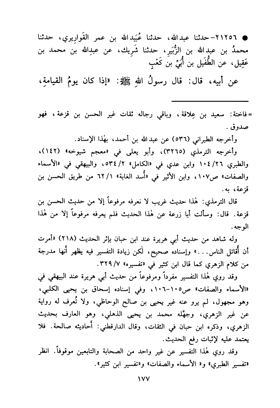 • ٢١٢٥٦ - حَدَّثَنَا عَبْدُ اللهِ حَدَّثَنَا عُبَيْدُ اللهِ بْنُ عُمَرَ الْقَوَارِيرِيُّ، حَدَّثَنَا مُحَمَّدُ بْنُ عَبْدِ اللهِ بْنِ الزُّبَيْرِ، حَدَّثَنَا شَرِيكٌ، عَنْ عَبْدِ اللهِ بْنِ مُحَمَّدِ بْنِ عَقِيلٍ، عَنْ الطُّفَيْلِ بْنِ أُبَيِّ بْنِ كَعْبٍ، عَنْ أَبِيهِ، قَالَ: قَالَ رَسُولُ اللهِ صَلَّى اللهُ عَلَيْهِ وَسَلَّمَ: "إِذَا كَانَ يَوْمُ الْقِيَامَةِ،