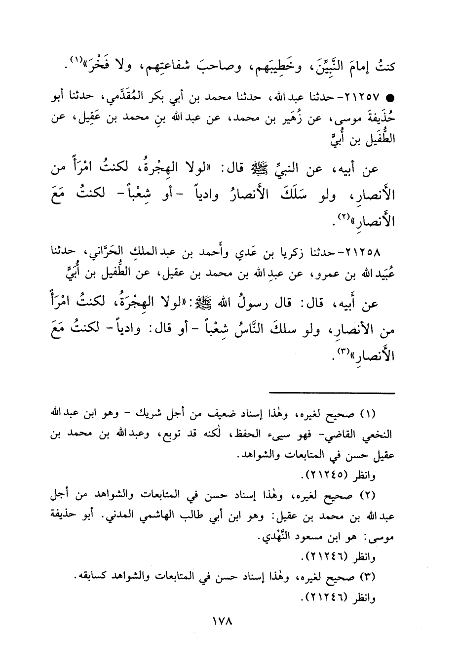 • ٢١٢٥٧ - حَدَّثَنَا عَبْدُ اللهِ حَدَّثَنَا مُحَمَّدُ بْنُ أَبِي بَكْرٍ الْمُقَدَّمِيُّ، حَدَّثَنَا أَبُو حُذَيْفَةَ مُوسَى، عَنْ زُهَيْرِ بْنِ مُحَمَّدٍ، عَنْ عَبْدِ اللهِ بْنِ مُحَمَّدِ بْنِ عَقِيلٍ، عَنِ الطُّفَيْلِ بْنِ أُبَيٍّ، عَنْ أَبِيهِ، عَنِ النَّبِيِّ صَلَّى اللهُ عَلَيْهِ وَسَلَّمَ قَالَ: "لَوْلَا الْهِجْرَةُ، لَكُنْتُ امْرَأً مِنَ الْأَنْصَارِ، وَلَوْ سَلَكَ الْأَنْصَارُ وَادِيًا أَوْ شِعْبًا، لَكُنْتُ مَعَ الْأَنْصَارِ " (٢)