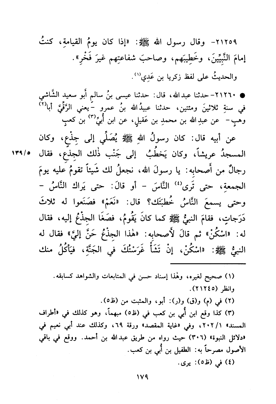 • ٢١٢٦٠ - حَدَّثَنَا عَبْدُ اللهِ قَالَ: حَدَّثَنَا عِيسَى بْنُ سَالِمٍ أَبُو سَعِيدٍ الشَّاشِيُّ فِي سَنَةِ ثَلَاثِينَ وَمِائَتَيْنِ، حَدَّثَنَا عُبَيْدُ اللهِ بْنُ عَمْرٍو يَعْنِي الرَّقِّيَّ أَبَا (٢) وَهْبٍ، عَنْ عَبْدِ اللهِ بْنِ مُحَمَّدِ بْنِ عَقِيلٍ، عَنْ ابْنِ أُبَيِّ (٣) بْنِ كَعْبٍ، عَنْ أَبِيهِ، قَالَ: كَانَ رَسُولُ اللهِ صَلَّى اللهُ عَلَيْهِ وَسَلَّمَ يُصَلِّي إِلَى جِذْعٍ، وَكَانَ الْمَسْجِدُ عَرِيشًا، وَكَانَ يَخْطُبُ إِلَى جَنْبِ ذَلِكَ الْجِذْعِ، فَقَالَ رِجَالٌ مِنْ أَصْحَابِهِ: يَا رَسُولَ اللهِ، نَجْعَلُ لَكَ شَيْئًا تَقُومُ عَلَيْهِ يَوْمَ الْجُمُعَةِ، حَتَّى تَرَى (٤) النَّاسَ، أَوْ قَالَ: حَتَّى يَرَاكَ النَّاسُ، وَحَتَّى يَسْمَعَ النَّاسُ خُطْبَتَكَ؟ قَالَ: "نَعَمْ " فَصَنَعُوا لَهُ ثَلَاثَ دَرَجَاتٍ، فَقَامَ النَّبِيُّ صَلَّى اللهُ عَلَيْهِ وَسَلَّمَ كَمَا كَانَ يَقُومُ، فَصَغَى الْجِذْعُ إِلَيْهِ، فَقَالَ لَهُ: "اسْكُنْ " ثُمَّ قَالَ لِأَصْحَابِهِ: "هَذَا الْجِذْعُ حَنَّ إِلَيَّ " فَقَالَ لَهُ النَّبِيُّ صَلَّى اللهُ عَلَيْهِ وَسَلَّمَ: "اسْكُنْ، إِنْ تَشَأْ غَرَسْتُكَ فِي الْجَنَّةِ، فيَأْكُلُ مِنْكَ