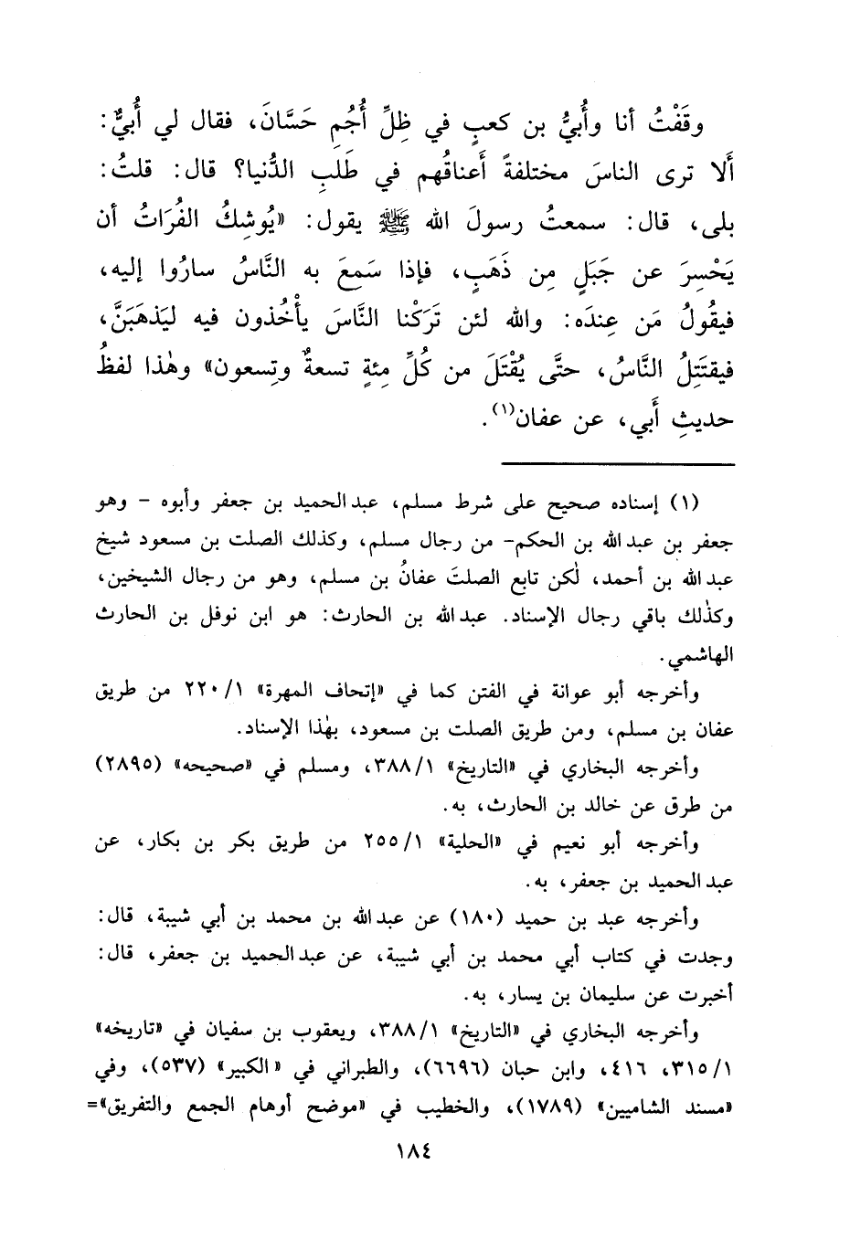 وَقَفْتُ أَنَا وَأُبَيُّ بْنُ كَعْبٍ فِي ظِلِّ أُجُمِ حَسَّانَ، فَقَالَ لِي أُبَيٌّ: أَلَا تَرَى النَّاسَ مُخْتَلِفَةً أَعْنَاقُهُمْ فِي طَلَبِ الدُّنْيَا؟ قَالَ: قُلْتُ: بَلَى، قَالَ: سَمِعْتُ رَسُولَ اللهِ صَلَّى اللهُ عَلَيْهِ وَسَلَّمَ يَقُولُ: "يُوشِكُ الْفُرَاتُ أَنْ يَحْسِرَ عَنْ جَبَلٍ مِنْ ذَهَبٍ، فَإِذَا سَمِعَ بِهِ النَّاسُ سَارُوا إِلَيْهِ، فَيَقُولُ مَنْ عِنْدَهُ: وَاللهِ لَئِنْ تَرَكْنَا النَّاسَ يَأْخُذُونَ فِيهِ لَيَذْهَبَنَّ، فَيَقْتَتِلُ النَّاسُ، حَتَّى يُقْتَلَ مِنْ كُلِّ مِائَةٍ تِسْعَةٌ وَتِسْعُونَ " وَهَذَا لَفْظُ حَدِيثِ أَبِي عَنْ عَفَّانَ (١)