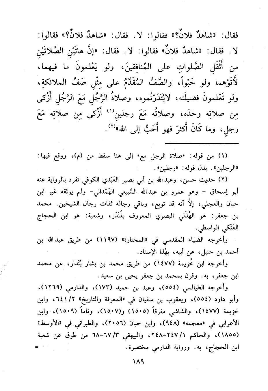 فَقَالَ " شَاهِدٌ فُلَانٌ؟ " فَقَالُوا: لَا. فَقَالَ: "شَاهِدٌ فُلَانٌ؟ " فَقَالُوا: لَا. فَقَالَ: "شَاهِدٌ فُلَانٌ " فَقَالُوا: لَا. فَقَالَ: "إِنَّ هَاتَيْنِ الصَّلَاتَيْنِ مِنْ أَثْقَلِ الصَّلَوَاتِ عَلَى الْمُنَافِقِينَ، وَلَوْ يَعْلَمُونَ مَا فِيهِمَا، لَأَتَوْهُمَا وَلَوْ حَبْوًا، وَالصَّفُّ الْمُقَدَّمُ عَلَى مِثْلِ صَفِّ الْمَلَائِكَةِ، وَلَوْ تَعْلَمُونَ فَضِيلَتَهُ، لَابْتَدَرْتُمُوهُ، وَصَلَاةُ الرَّجُلِ مَعَ الرَّجُلَ أَزْكَى مِنْ صَلَاتِهِ وَحْدَهُ وَصَلَاتُهُ مَعَ رَجُلَيْنِ (١) أَزْكَى مِنْ صَلَاتِهِ مَعَ رَجُلٍ، وَمَا كَانَ أَكْثَرَ فَهُوَ أَحَبُّ إِلَى اللهِ " (٢)
