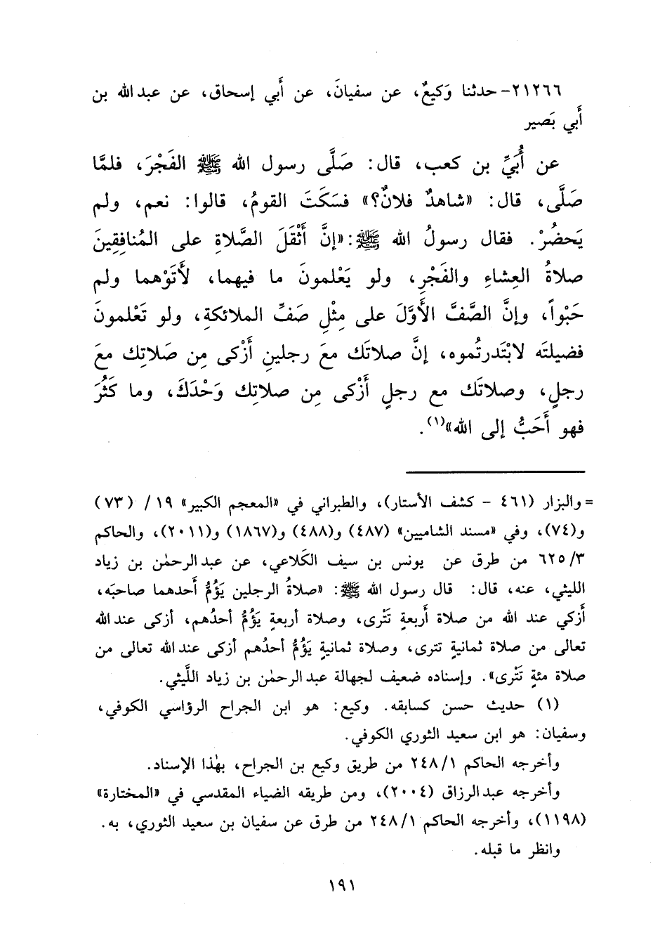 ٢١٢٦٦ - حَدَّثَنَا وَكِيعٌ، عَنْ سُفْيَانَ، عَنْ أَبِي إِسْحَاقَ، عَنْ عَبْدِ اللهِ بْنِ أَبِي بَصِيرٍ، عَنْ أُبَيِّ بْنِ كَعْبٍ، قَالَ: صَلَّى رَسُولُ اللهِ صَلَّى اللهُ عَلَيْهِ وَسَلَّمَ الْفَجْرَ، فَلَمَّا صَلَّى، قَالَ: "شَاهِدٌ فُلَانٌ؟ " فَسَكَتَ الْقَوْمُ، قَالُوا: نَعَمْ، وَلَمْ يَحْضُرْ. فَقَالَ رَسُولُ اللهِ صَلَّى اللهُ عَلَيْهِ وَسَلَّمَ: "إِنَّ أَثْقَلَ الصَّلَاةِ عَلَى الْمُنَافِقِينَ صَلَاةُ الْعِشَاءِ وَالْفَجْرِ، وَلَوْ يَعْلَمُونَ مَا فِيهِمَا، لَأَتَوْهُمَا وَلَوْ حَبْوًا، وَإِنَّ الصَّفَّ الْأَوَّلَ عَلَى مِثْلِ صَفِّ الْمَلَائِكَةِ، وَلَوْ تَعْلَمُونَ فَضِيلَتَهُ لَابْتَدَرْتُمُوهُ، إِنَّ صَلَاتَكَ مَعَ رَجُلَيْنِ أَزْكَى مِنْ صَلَاتِكَ مَعَ رَجُلٍ، وَصَلَاتَكَ مَعَ رَجُلٍ أَزْكَى مِنْ صَلَاتِكَ وَحْدَكَ، وَمَا كَثُرَ فَهُوَ أَحَبُّ إِلَى اللهِ " (١)