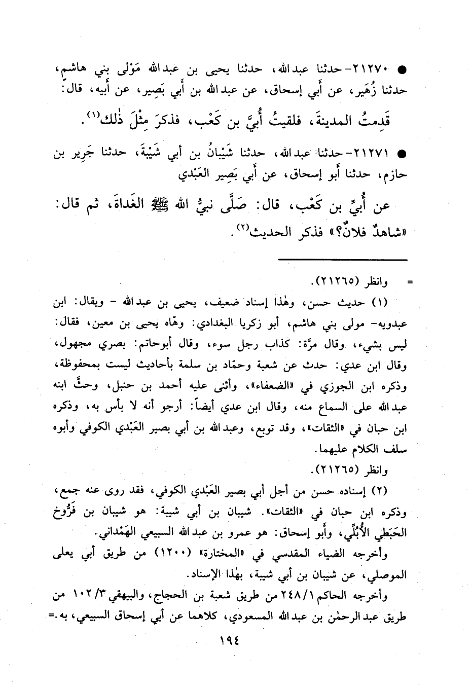 • ٢١٢٧١ - حَدَّثَنَا عَبْدُ اللهِ، حَدَّثَنَا شَيْبَانُ بْنُ أَبِي شَيْبَةَ، حَدَّثَنَا جَرِيرُ بْنُ حَازِمٍ، حَدَّثَنَا أَبُو إِسْحَاقَ، عَنْ أَبِي بَصِيرٍ الْعَبْدِيِّ، عَنْ أُبَيِّ بْنِ كَعْبٍ، قَالَ: صَلَّى نَبِيُّ اللهِ صَلَّى اللهُ عَلَيْهِ وَسَلَّمَ الْغَدَاةَ، ثُمَّ قَالَ: "شَاهِدٌ فُلَانٌ "، فَذَكَرَ الْحَدِيثَ (٢)