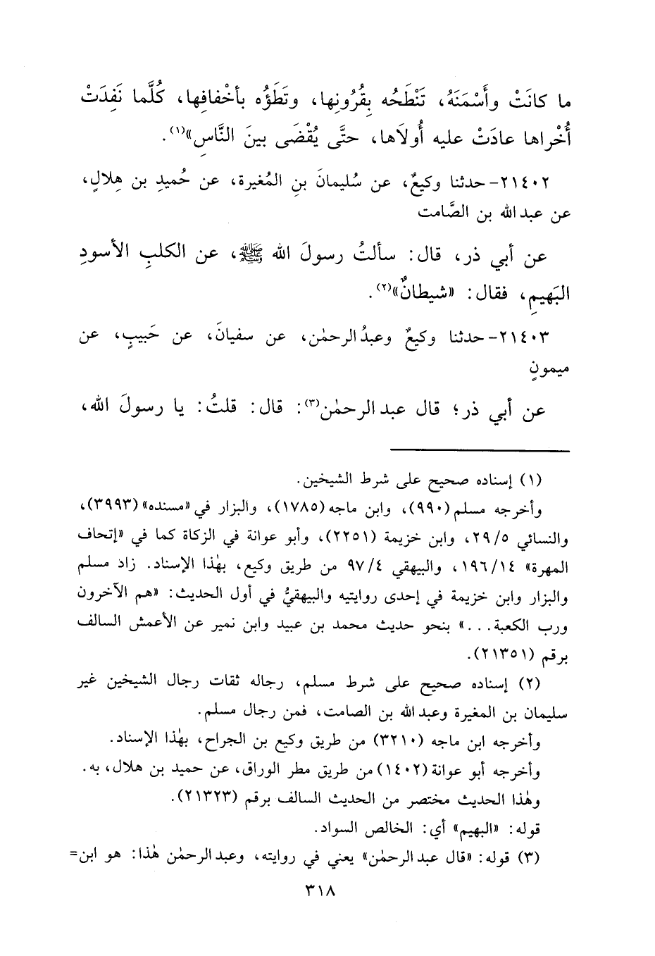 ٢١٤٠٢ - حَدَّثَنَا وَكِيعٌ، عَنْ سُلَيْمَانَ بْنِ الْمُغِيرَةِ، عَنْ حُمَيْدِ بْنِ هِلَالٍ، عَنْ عَبْدِ اللهِ بْنِ الصَّامِتِ، عَنْ أَبِي ذَرٍّ، قَالَ: سَأَلْتُ رَسُولَ اللهِ صَلَّى اللهُ عَلَيْهِ وَسَلَّمَ عَنِ الْكَلْبِ الْأَسْوَدِ الْبَهِيمِ، فَقَالَ: "شَيْطَانٌ " (٢)