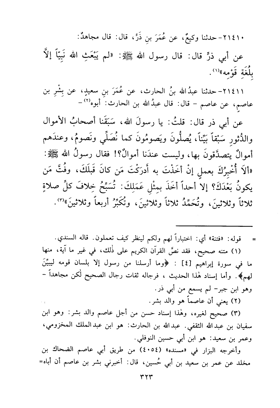 (١) متنه صحيح، فقد نصَّ القرآن الكريم على ذلك، في غير ما آية، منها ما في سورة إبراهيم [٤] : {وَمَا أَرْسَلْنَا مِنْ رَسُولٍ إِلَّا بِلِسَانِ قَوْمِهِ لِيُبَيِّنَ لَهُمْ} . وأما إسناد هذا الحديث، فرجاله ثقات رجال الصحيح لكن مجاهداً -وهو ابن جبر- لم يسمع من أبي ذر.