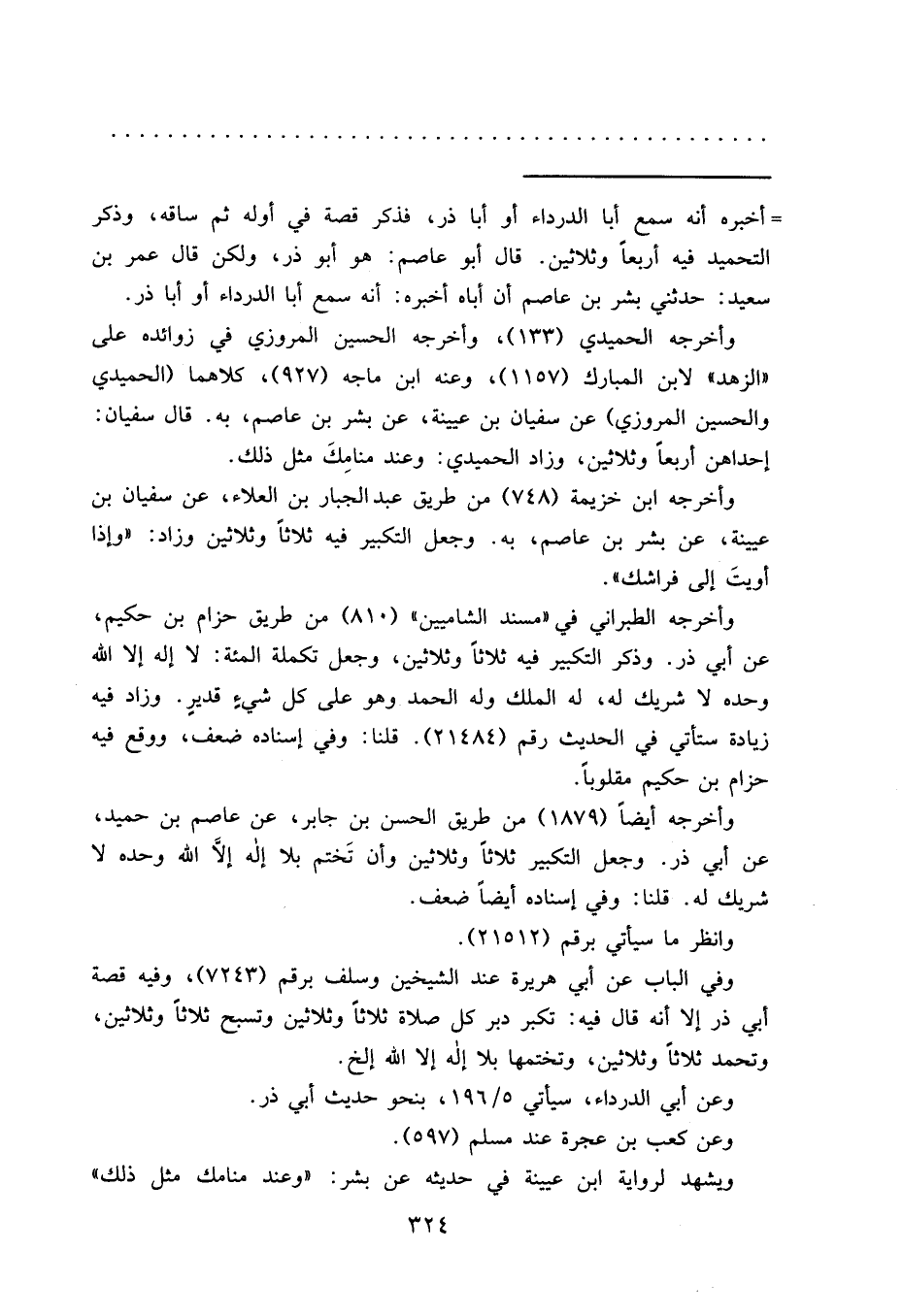 وأخرجه الحميدي (١٣٣) ، وأخرجه الحسين المروزي في زوائده على "الزهد" لابن المبارك (١١٥٧) ، وعنه ابن ماجه (٩٢٧) ، كلاهما (الحميدي والحسين المروزي) عن سفيان بن عيينة، عن بشر بن عاصم، به. قال سفيان: إحداهن أربعاً وثلاثين، وزاد الحميدي: وعند منامِكَ مثل ذلك.