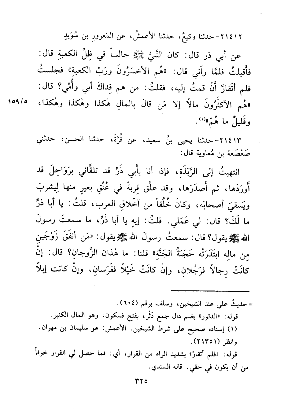 ٢١٤١٢ - حَدَّثَنَا وَكِيعٌ، حَدَّثَنَا الْأَعْمَشُ، عَنْ الْمَعْرُورِ بْنِ سُوَيْدٍ، عَنْ أَبِي ذَرٍّ، قَالَ: كَانَ النَّبِيُّ صَلَّى اللهُ عَلَيْهِ وَسَلَّمَ جَالِسًا فِي ظِلِّ الْكَعْبَةِ قَالَ: فَأَقْبَلْتُ فَلَمَّا رَآنِي قَالَ: "هُمُ الْأَخْسَرُونَ وَرَبِّ الْكَعْبَةِ " فَجَلَسْتُ فَلَمْ أَتَقَارَّ أَنْ قُمْتُ إِلَيْهِ، فَقُلْتُ: مَنْ هُمْ فِدَاكَ أَبِي وَأُمِّي؟ قَالَ: "هُمُ الْأَكْثَرُونَ مَالًا إِلَّا مَنْ قَالَ بِالْمَالِ هَكَذَا وَهَكَذَا وَهَكَذَا، وَقَلِيلٌ مَا هُمْ " (١)