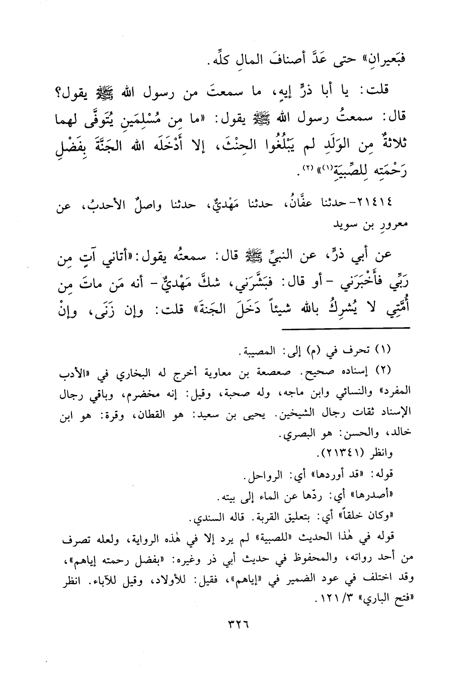 قُلْتُ: يَا أَبَا ذَرٍّ إِيهِ، مَا سَمِعْتَ مِنْ رَسُولِ اللهِ صَلَّى اللهُ عَلَيْهِ وَسَلَّمَ يَقُولُ؟ قَالَ: سَمِعْتُ رَسُولَ اللهِ صَلَّى اللهُ عَلَيْهِ وَسَلَّمَ يَقُولُ: "مَا مِنْ مُسْلِمَيْنِ يُتَوَفَّى لَهُمْ ثَلَاثَةٌ مِنَ الْوَلَدِ لَمْ يَبْلُغُوا الْحِنْثَ، إِلَّا أَدْخَلَهُ اللهُ الْجَنَّةَ بِفَضْلِ رَحْمَتِهِ لِلصِّبْيَةِ (١) " (٢)
