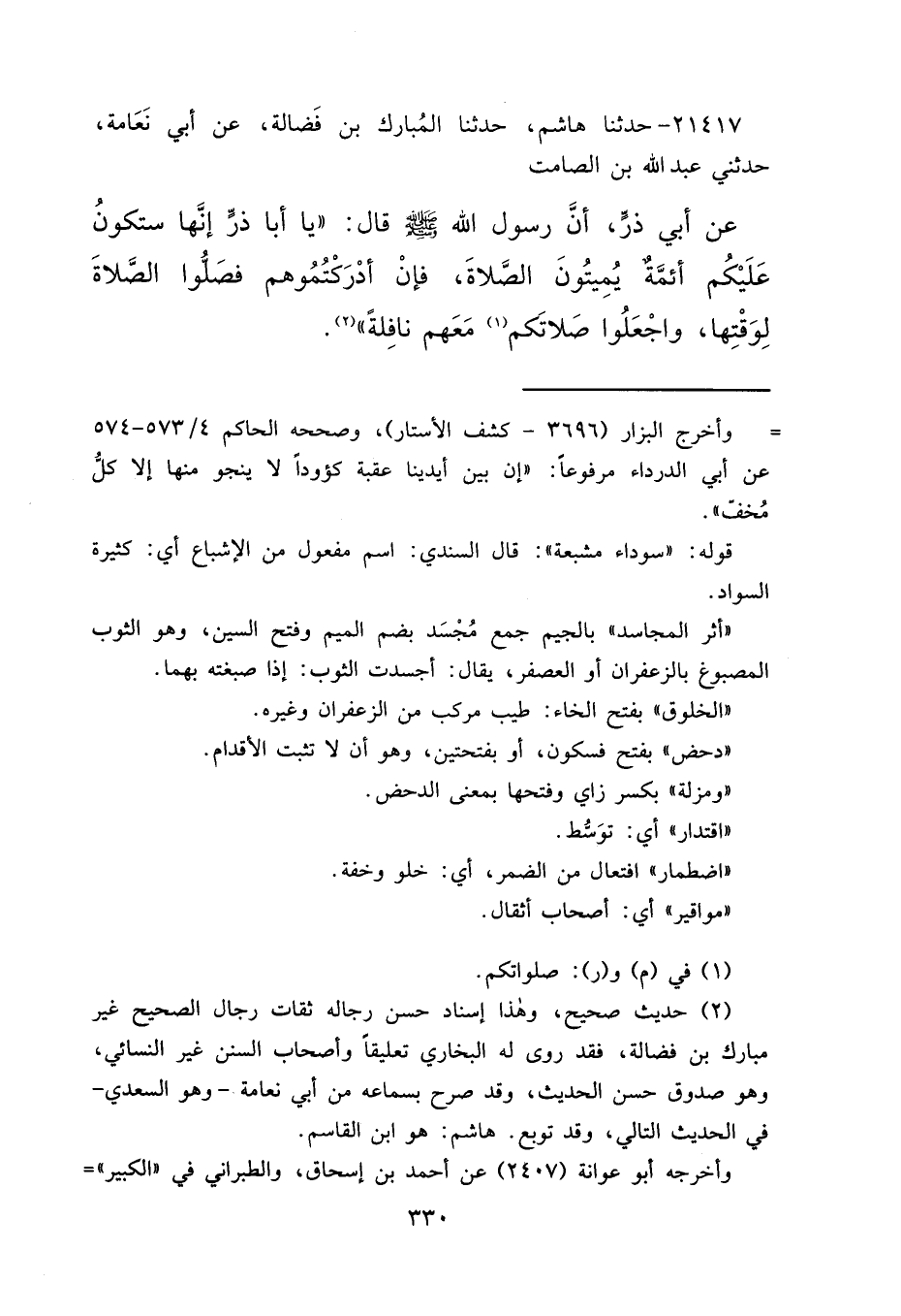٢١٤١٧ - حَدَّثَنَا هَاشِمٌ، حَدَّثَنَا الْمُبَارَكُ بْنُ فَضَالَةَ، عَنْ أَبِي نَعَامَةَ، حَدَّثَنِي عَبْدُ اللهِ بْنُ الصَّامِتِ، عَنْ أَبِي ذَرٍّ، أَنَّ رَسُولَ اللهِ صَلَّى اللهُ عَلَيْهِ وَسَلَّمَ قَالَ: "يَا أَبَا ذَرٍّ، إِنَّهَا سَتَكُونُ عَلَيْكُمْ أَئِمَّةٌ يُمِيتُونَ الصَّلَاةَ، فَإِنْ أَدْرَكْتُمُوهُمْ فَصَلُّوا الصَّلَاةَ لِوَقْتِهَا، وَاجْعَلُوا صَلَاتَكُمْ (١) مَعَهُمْ نَافِلَةً " (٢)
