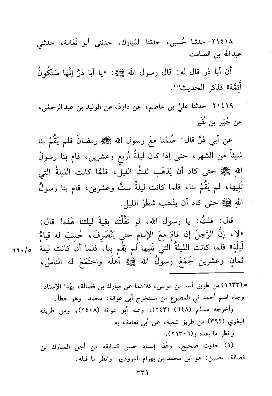 ٢١٤١٨ - حَدَّثَنَا حُسَيْنٌ، حَدَّثَنَا الْمُبَارَكُ، حَدَّثَنِي أَبُو نَعَامَةَ، حَدَّثَنِي عَبْدُ اللهِ بْنُ الصَّامِتِ، أَنَّ أَبَا ذَرٍّ، قَالَ لَهُ: قَالَ رَسُولُ اللهِ صَلَّى اللهُ عَلَيْهِ وَسَلَّمَ: "يَا أَبَا ذَرٍّ، إِنَّهَا سَتَكُونُ أَئِمَّةٌ " فَذَكَرَ الْحَدِيثَ (١)
