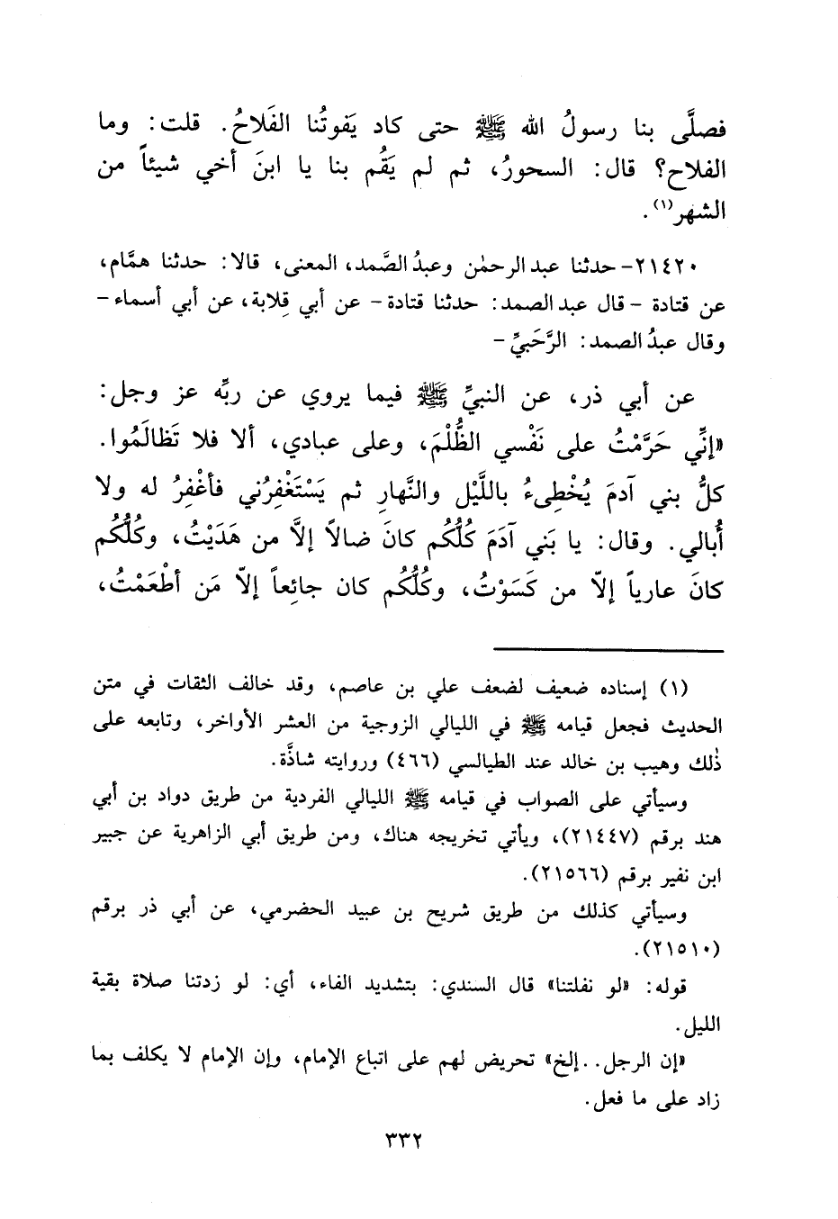 ٢١٤٢٠ - حَدَّثَنَا عَبْدُ الرَّحْمَنِ، وَعَبْدُ الصَّمَدِ، الْمَعْنَى، قَالَا: حَدَّثَنَا هَمَّامٌ، عَنْ قَتَادَةَ، قَالَ عَبْدُ الصَّمَدِ: حَدَّثَنَا قَتَادَةُ، عَنْ أَبِي قِلَابَةَ، عَنْ أَبِي أَسْمَاءَ، وَقَالَ عَبْدُ الصَّمَدِ: الرَّحَبِيُّ، عَنْ أَبِي ذَرٍّ، عَنِ النَّبِيِّ صَلَّى اللهُ عَلَيْهِ وَسَلَّمَ فِيمَا يَرْوِي عَنْ رَبِّهِ عَزَّ وَجَلَّ: "إِنِّي حَرَّمْتُ عَلَى نَفْسِي الظُّلْمَ، وَعَلَى عِبَادِي، أَلَا فَلَا تَظَالَمُوا. كُلُّ بَنِي آدَمَ يُخْطِئُ بِاللَّيْلِ وَالنَّهَارِ ثُمَّ يَسْتَغْفِرُنِي فَأَغْفِرُ لَهُ وَلَا أُبَالِي "