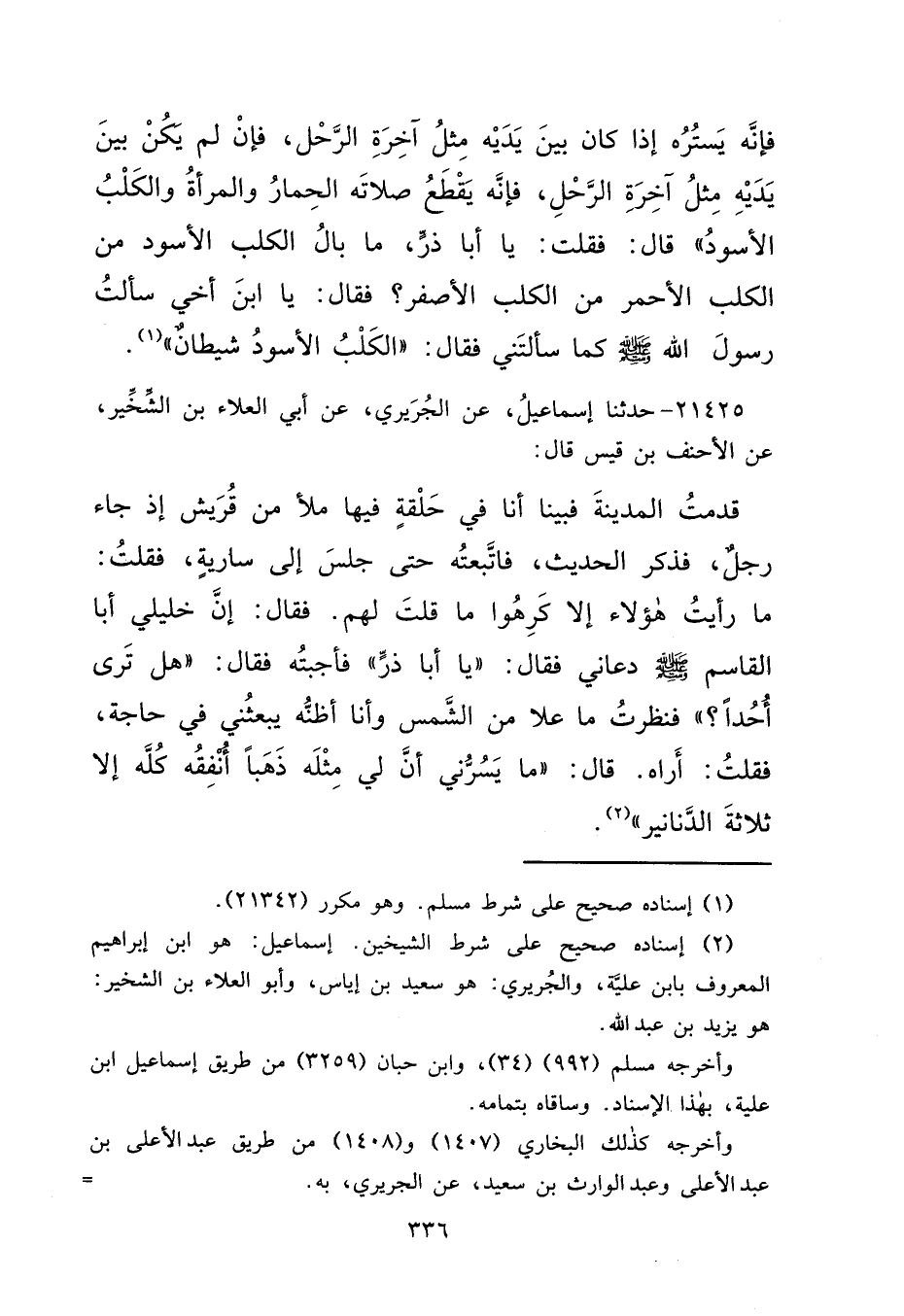 ٢١٤٢٥ - حَدَّثَنَا إِسْمَاعِيلُ، عَنِ الْجُرَيْرِيِّ، عَنْ أَبِي الْعَلَاءِ بْنِ الشِّخِّيرِ، عَنْ الْأَحْنَفِ بْنِ قَيْسٍ، قَالَ: قَدِمْتُ الْمَدِينَةَ فَبَيْنَا أَنَا فِي حَلَقَةٍ فِيهَا مَلَأٌ مِنْ قُرَيْشٍ إِذْ جَاءَ رَجُلٌ، فَذَكَرَ الْحَدِيثَ، فَاتَّبَعْتُهُ حَتَّى جَلَسَ إِلَى سَارِيَةٍ، فَقُلْتُ: مَا رَأَيْتُ هَؤُلَاءِ إِلَّا كَرِهُوا مَا قُلْتَ لَهُمْ. فَقَالَ: إِنَّ خَلِيلِي أَبَا الْقَاسِمِ صَلَّى اللهُ عَلَيْهِ وَسَلَّمَ دَعَانِي فَقَالَ: "يَا أَبَا ذَرٍّ " فَأَجَبْتُهُ فَقَالَ: "هَلْ تَرَى أُحُدًا؟ " فَنَظَرْتُ مَا عَلَا مِنَ الشَّمْسِ وَأَنَا أَظُنُّهُ يَبْعَثُنِي فِي حَاجَةٍ، فَقُلْتُ: أَرَاهُ. قَالَ: "مَا يَسُرُّنِي أَنَّ لِي مِثْلَهُ ذَهَبًا أُنْفِقُهُ كُلَّهُ إِلَّا ثَلَاثَةَ الدَّنَانِيرِ " (٢)