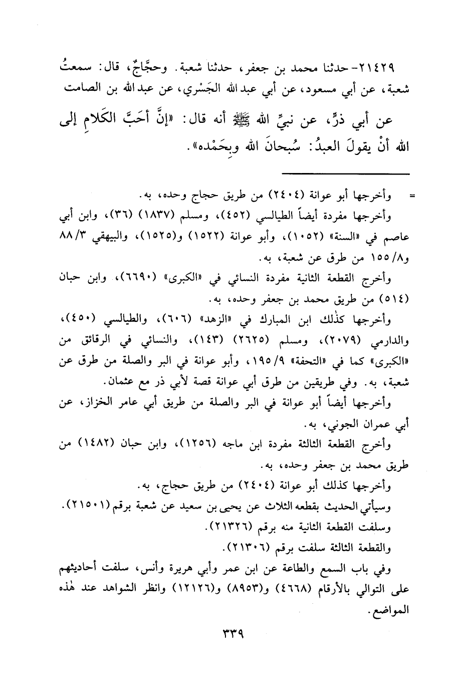 ٢١٤٢٩ - حَدَّثَنَا مُحَمَّدُ بْنُ جَعْفَرٍ، حَدَّثَنَا شُعْبَةُ، وَحَجَّاجٌ، قَالَ: سَمِعْتُ شُعْبَةَ، عَنْ أَبِي مَسْعُودٍ، عَنْ أَبِي عَبْدِ اللهِ الْجَسْرِيِّ، عَنْ عَبْدِ اللهِ بْنِ الصَّامِتِ، عَنْ أَبِي ذَرٍّ، عَنْ نَبِيِّ اللهِ صَلَّى اللهُ عَلَيْهِ وَسَلَّمَ أَنَّهُ قَالَ: "إِنَّ أَحَبَّ الْكَلَامِ إِلَى اللهِ أَنْ يَقُولَ الْعَبْدُ: سُبْحَانَ اللهِ وَبِحَمْدِهِ "