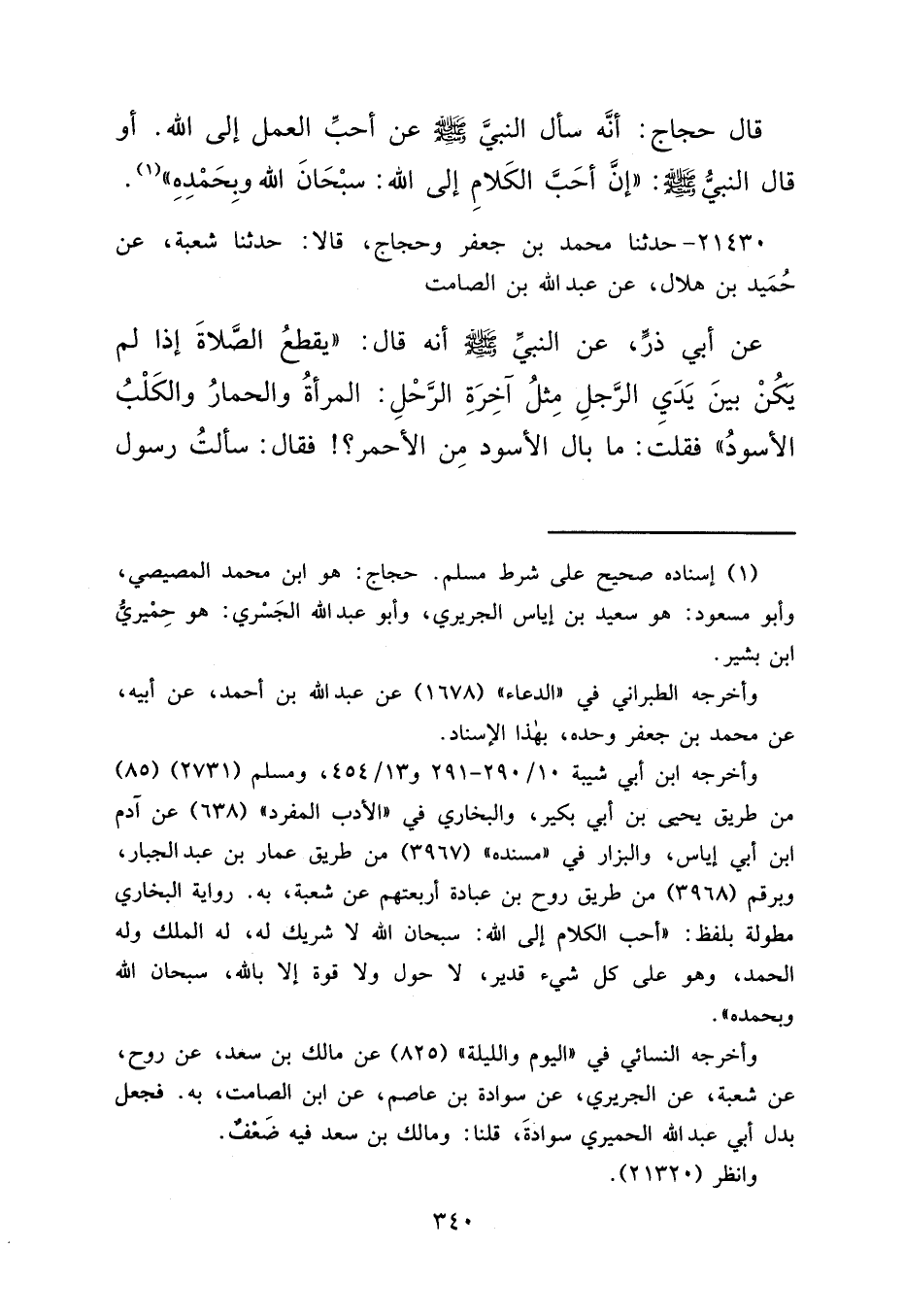 قَالَ حَجَّاجٌ: إِنَّهُ سَأَلَ النَّبِيَّ صَلَّى اللهُ عَلَيْهِ وَسَلَّمَ عَنْ أَحَبِّ الْعَمَلِ إِلَى اللهِ. أَوْ قَالَ النَّبِيُّ صَلَّى اللهُ عَلَيْهِ وَسَلَّمَ: "إِنَّ أَحَبَّ الْكَلَامِ إِلَى اللهِ: سُبْحَانَ اللهِ وَبِحَمْدِهِ " (١)