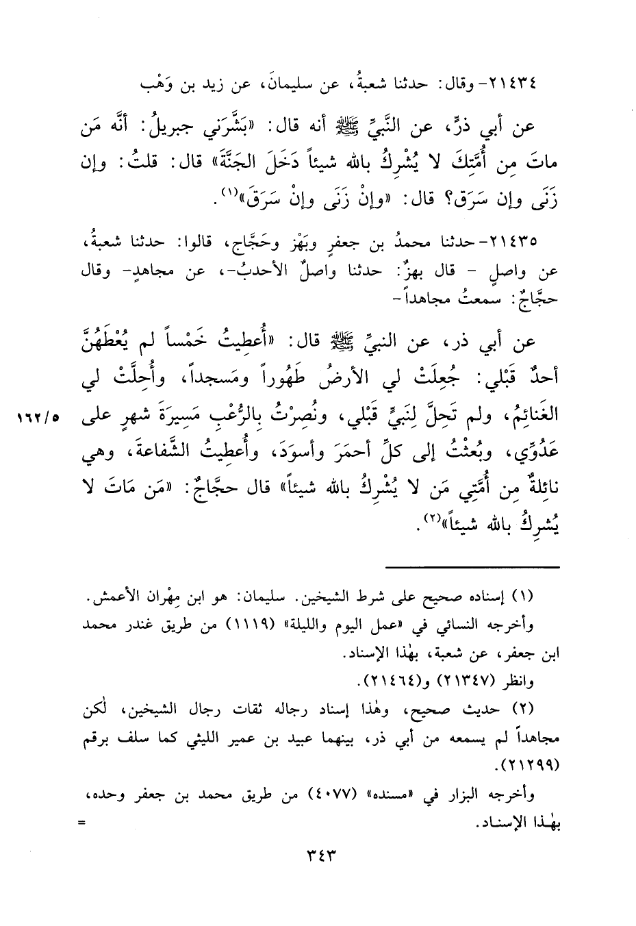 ٢١٤٣٥ - حَدَّثَنَا مُحَمَّدُ بْنُ جَعْفَرٍ، وَبَهْزٌ، وَحَجَّاجٌ، قَالُوا: حَدَّثَنَا شُعْبَةُ، عَنْ وَاصِلٍ، قَالَ بَهْزٌ: حَدَّثَنَا وَاصِلٌ الْأَحْدَبُ، عَنْ مُجَاهِدٍ، وَقَالَ حَجَّاجٌ: سَمِعْتُ مُجَاهِدًا، عَنْ أَبِي ذَرٍّ، عَنِ النَّبِيِّ صَلَّى اللهُ عَلَيْهِ وَسَلَّمَ قَالَ: "أُعْطِيتُ خَمْسًا لَمْ يُعْطَهُنَّ أَحَدٌ قَبْلِي: جُعِلَتْ لِي الْأَرْضُ طَهُورًا وَمَسْجِدًا، وَأُحِلَّتْ لِي الْغَنَائِمُ، وَلَمْ تَحِلَّ لِنَبِيٍّ قَبْلِي، وَنُصِرْتُ بِالرُّعْبِ مَسِيرَةَ شَهْرٍ عَلَى عَدُوِّي، وَبُعِثْتُ إِلَى كُلِّ أَحْمَرَ وَأَسْوَدَ، وَأُعْطِيتُ الشَّفَاعَةَ، وَهِيَ نَائِلَةٌ مِنْ أُمَّتِي مَنْ لَا يُشْرِكُ بِاللهِ شَيْئًا " قَالَ حَجَّاجٌ: "مَنْ مَاتَ لَا يُشْرِكُ بِاللهِ شَيْئًا " (٢)