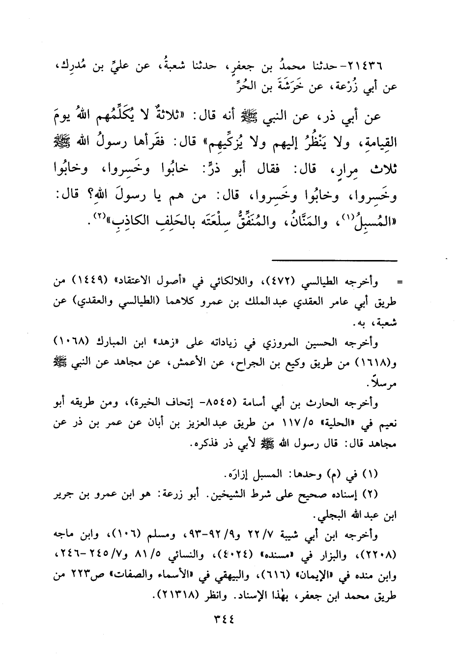 ٢١٤٣٦ - حَدَّثَنَا مُحَمَّدُ بْنُ جَعْفَرٍ، حَدَّثَنَا شُعْبَةُ، عَنْ عَلِيِّ بْنِ مُدْرِكٍ، عَنْ أَبِي زُرْعَةَ، عَنْ خَرَشَةَ بْنِ الْحُرِّ، عَنْ أَبِي ذَرٍّ، عَنِ النَّبِيِّ صَلَّى اللهُ عَلَيْهِ وَسَلَّمَ أَنَّهُ قَالَ: "ثَلَاثَةٌ لَا يُكَلِّمُهُمُ اللهُ يَوْمَ الْقِيَامَةِ، وَلَا يَنْظُرُ إِلَيْهِمْ، وَلَا يُزَكِّيهِمْ " قَالَ: فَقَرَأَهَا رَسُولُ اللهِ صَلَّى اللهُ عَلَيْهِ وَسَلَّمَ ثَلَاثَ مَرَّاتٍ، قَالَ: فَقَالَ أَبُو ذَرٍّ: خَابُوا وَخَسِرُوا، خَابُوا وَخَسِرُوا، خَابُوا وَخَسِرُوا، قَالَ: مَنْ هُمْ يَا رَسُولَ اللهِ؟ قَالَ: "الْمُسْبِلُ (١) ، وَالْمَنَّانُ، وَالْمُنَفِّقُ سِلْعَتَهُ بِالْحَلِفِ الْكَاذِبِ " (٢)