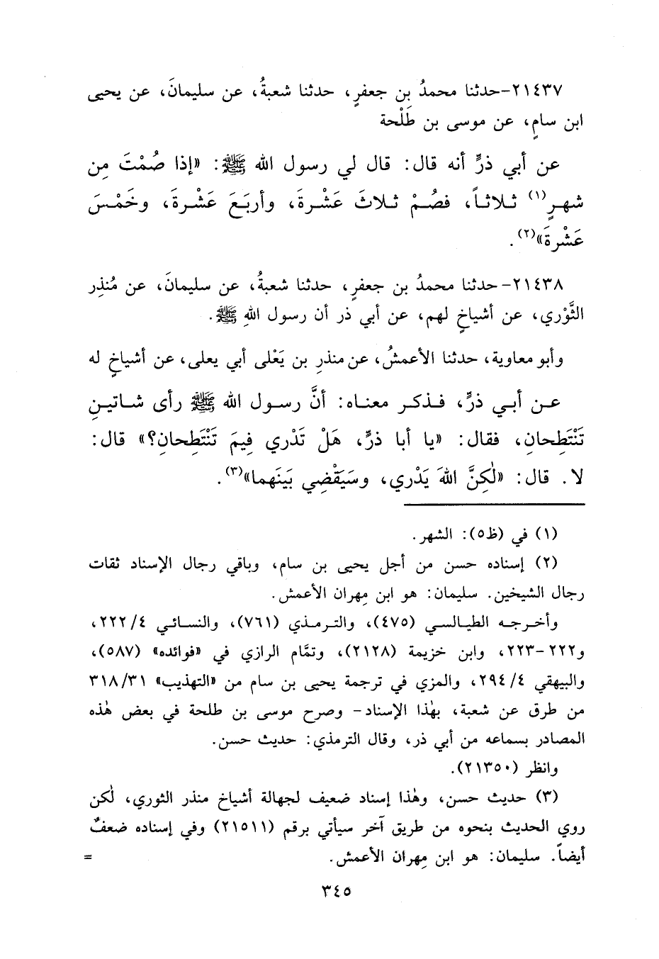 ٢١٤٣٧ - حَدَّثَنَا مُحَمَّدُ بْنُ جَعْفَرٍ، حَدَّثَنَا شُعْبَةُ، عَنْ سُلَيْمَانَ، عَنْ يَحْيَى بْنِ سَامٍ، عَنْ مُوسَى بْنِ طَلْحَةَ، عَنْ أَبِي ذَرٍّ، أَنَّهُ قَالَ: قَالَ لِي رَسُولُ اللهِ صَلَّى اللهُ عَلَيْهِ وَسَلَّمَ: "إِذَا صُمْتَ مِنْ شَهْرٍ (١) ثَلَاثًا، فَصُمْ ثَلَاثَ عَشْرَةَ، وَأَرْبَعَ عَشْرَةَ، وَخَمْسَ عَشْرَةَ " (٢)