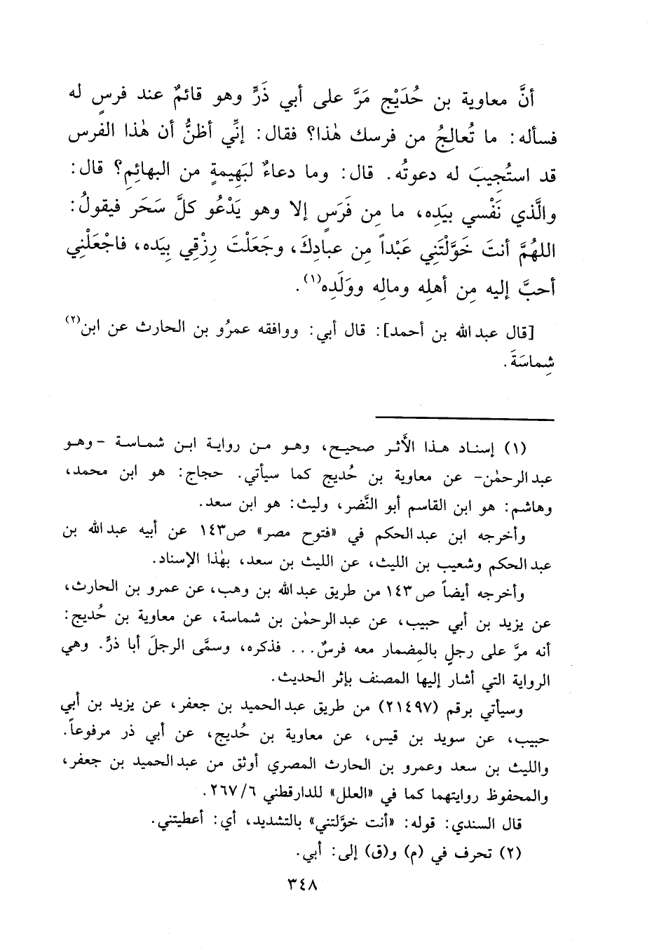 أَنَّ مُعَاوِيَةَ بْنَ حُدَيْجٍ مَرَّ عَلَى أَبِي ذَرٍّ، وَهُوَ قَائِمٌ عِنْدَ فَرَسٍ لَهُ فَسَأَلَهُ: مَا تُعَالِجُ مِنْ فَرَسِكَ هَذَا؟ فَقَالَ: "إِنِّي أَظُنُّ أَنَّ هَذَا الْفَرَسَ قَدْ اسْتُجِيبَ لَهُ دَعْوَتُهُ ". قَالَ: وَمَا دُعَاءُ الْبَهِيمَةِ مِنَ الْبَهَائِمِ؟ قَالَ: "وَالَّذِي نَفْسِي بِيَدِهِ، مَا مِنْ فَرَسٍ إِلَّا وَهُوَ يَدْعُو كُلَّ سَحَرٍ فَيَقُولُ: اللهُمَّ أَنْتَ خَوَّلْتَنِي عَبْدًا مِنْ عِبَادِكَ، وَجَعَلْتَ رِزْقِي بِيَدِهِ، فَاجْعَلْنِي أَحَبَّ إِلَيْهِ مِنْ أَهْلِهِ وَمَالِهِ وَوَلَدِهِ " (١) قَالَ عَبْدُ اللهِ بْنُ أَحْمَدَ قَالَ أَبِي: "وَوَافَقَهُ عَمْرُو بْنُ الْحَارِثِ عَنْ ابْنِ (٢) شِمَاسَةَ "