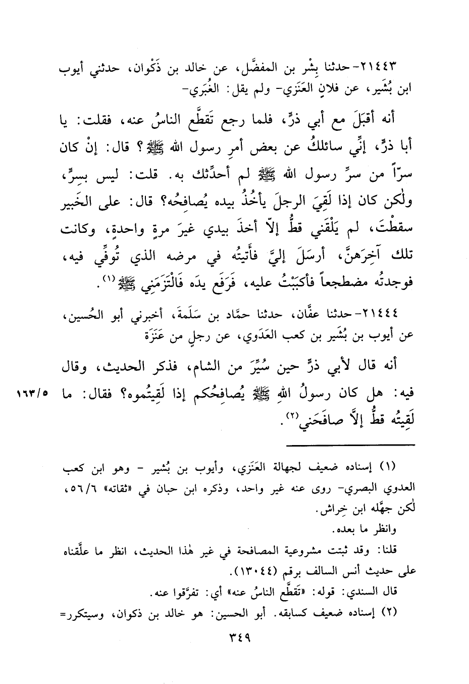 ٢١٤٤٤ - حَدَّثَنَا عَفَّانُ، حَدَّثَنَا حَمَّادُ بْنُ سَلَمَةَ، أَخْبَرَنِي أَبُو الْحُسَيْنِ، عَنْ أَيُّوبَ بْنِ بُشَيْرِ بْنِ كَعْبٍ الْعَدَوِيِّ، عَنْ رَجُلٍ، مِنْ عَنَزَةَ، أَنَّهُ قَالَ لِأَبِي ذَرٍّ حِينَ سُيِّرَ مِنَ الشَّامِ، فَذَكَرَ الْحَدِيثَ، وَقَالَ فِيهِ: هَلْ كَانَ رَسُولُ اللهِ صَلَّى اللهُ عَلَيْهِ وَسَلَّمَ يُصَافِحُكُمْ إِذَا لَقِيتُمُوهُ؟ فَقَالَ: مَا لَقِيتُهُ قَطُّ إِلَّا صَافَحَنِي (٢)