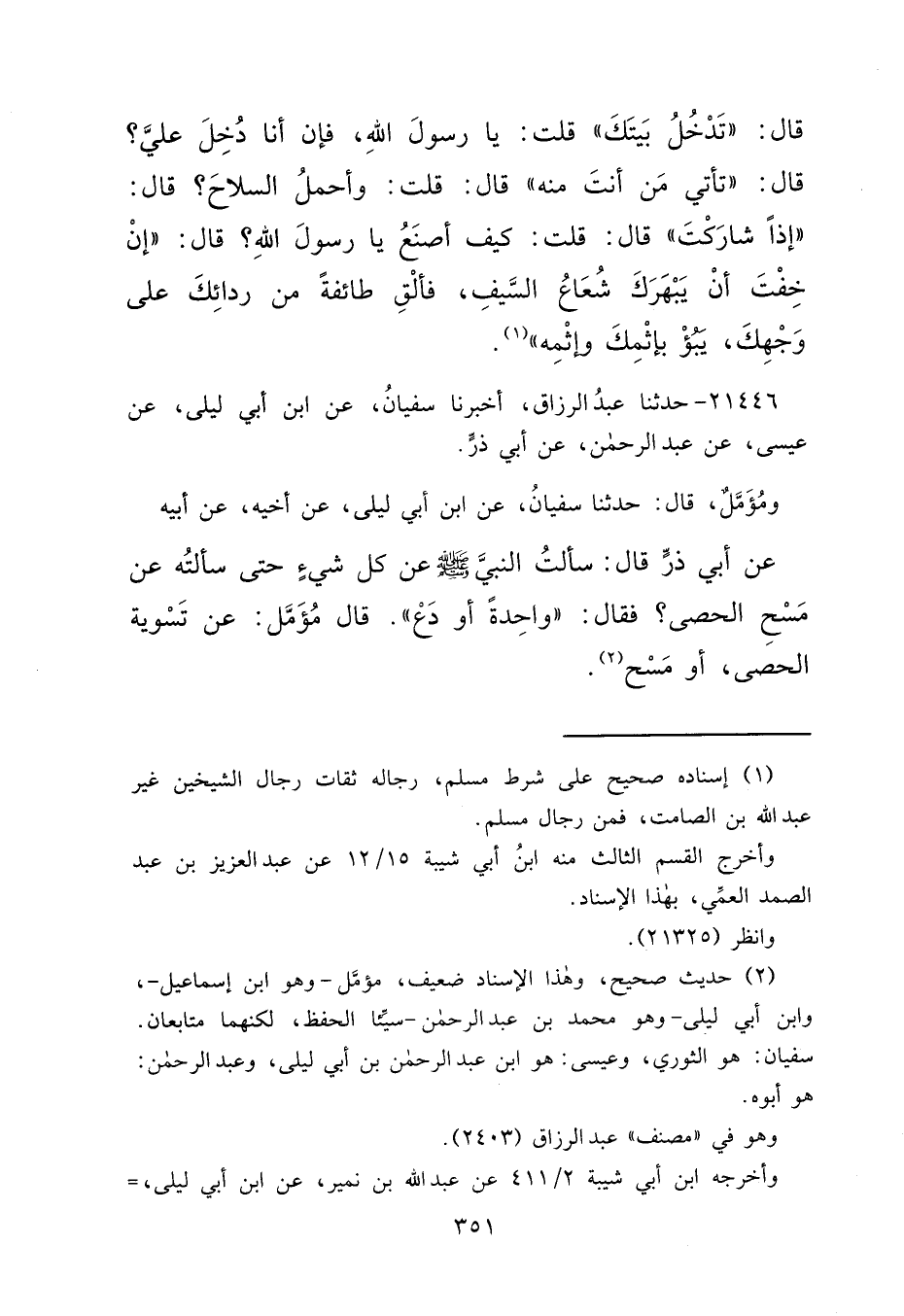 ٢١٤٤٦ - حَدَّثَنَا عَبْدُ الرَّزَّاقِ، أَخْبَرَنَا سُفْيَانُ، عَنِ ابْنِ أَبِي لَيْلَى، عَنْ عِيسَى، عَنْ عَبْدِ الرَّحْمَنِ، عَنْ أَبِي ذَرٍّ، وَمُؤَمَّلٌ، قَالَ: حَدَّثَنَا سُفْيَانُ، عَنْ ابْنِ أَبِي لَيْلَى، عَنْ أَخِيهِ، عَنْ أَبِيهِ، عَنْ أَبِي ذَرٍّ، قَالَ: سَأَلْتُ النَّبِيَّ صَلَّى اللهُ عَلَيْهِ وَسَلَّمَ عَنْ كُلِّ شَيْءٍ حَتَّى سَأَلْتُهُ عَنْ مَسْحِ الْحَصَى؟ فَقَالَ: "وَاحِدَةً أَوْ دَعْ " قَالَ مُؤَمَّلٌ: عَنْ تَسْوِيَةِ الْحَصَى، أَوْ مَسْحِ (٢)