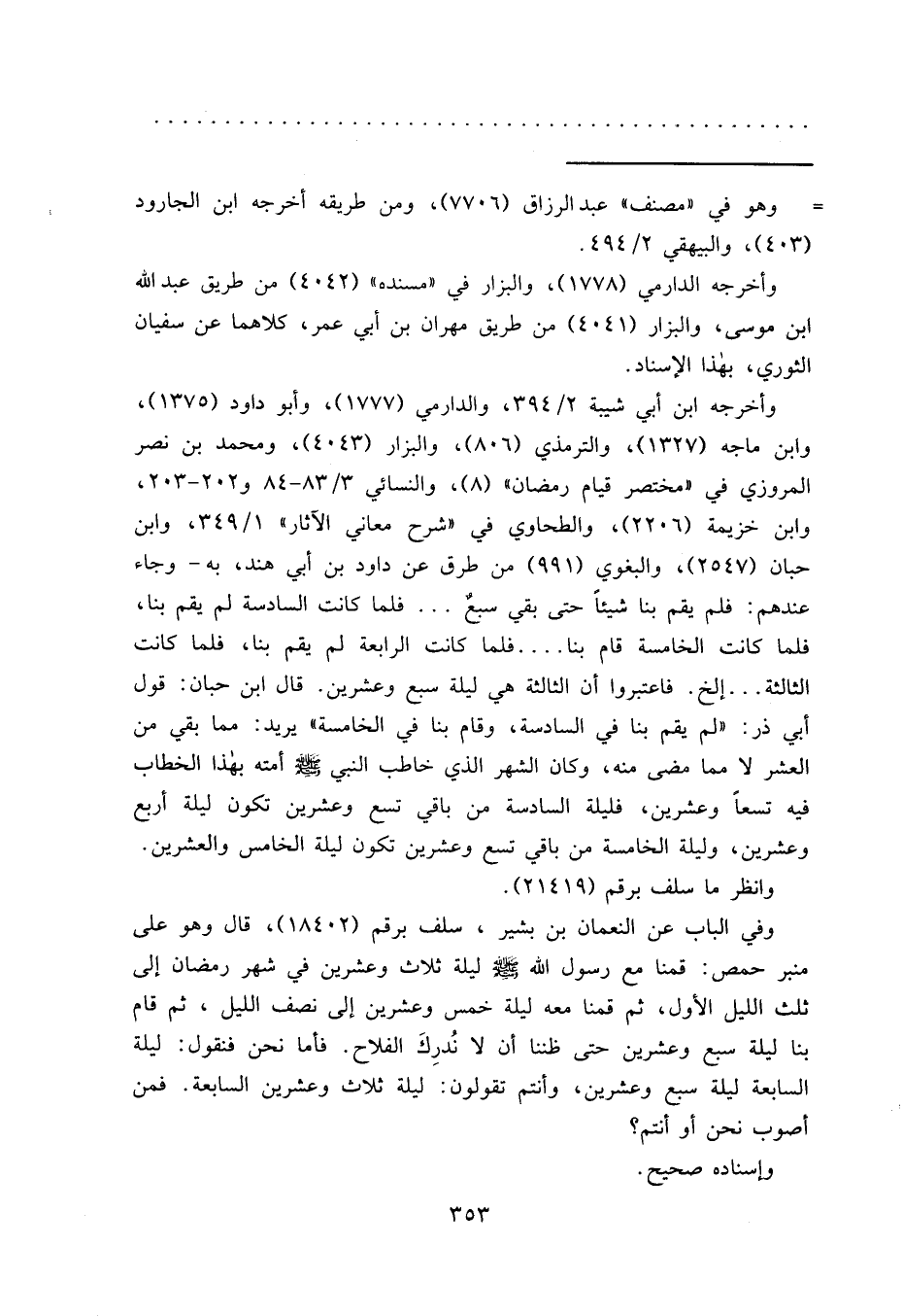 وفي الباب عن النعمان بن بشير، سلف برقم (١٨٤٠٢) ، قال وهو على منبر حمص: قمنا مع رسول الله صَلَّى اللهُ عَلَيْهِ وَسَلَّمَ ليلة ثلاث وعشرين في شهر رمضان إلى ثلث الليل الأول، ثم قمنا معه ليلة خمس وعشرين إلى نصف الليل، ثم قام بنا ليلة سبع وعشرين حتى ظننا أن لا نُدرِكَ الفلاح. فأما نحن فنقول: ليلة السابعة ليلة سبع وعشرين، وأنتم تقولون: ليلة ثلاث وعشرين السابعة. فمن أصوب نحن أو أنتم؟