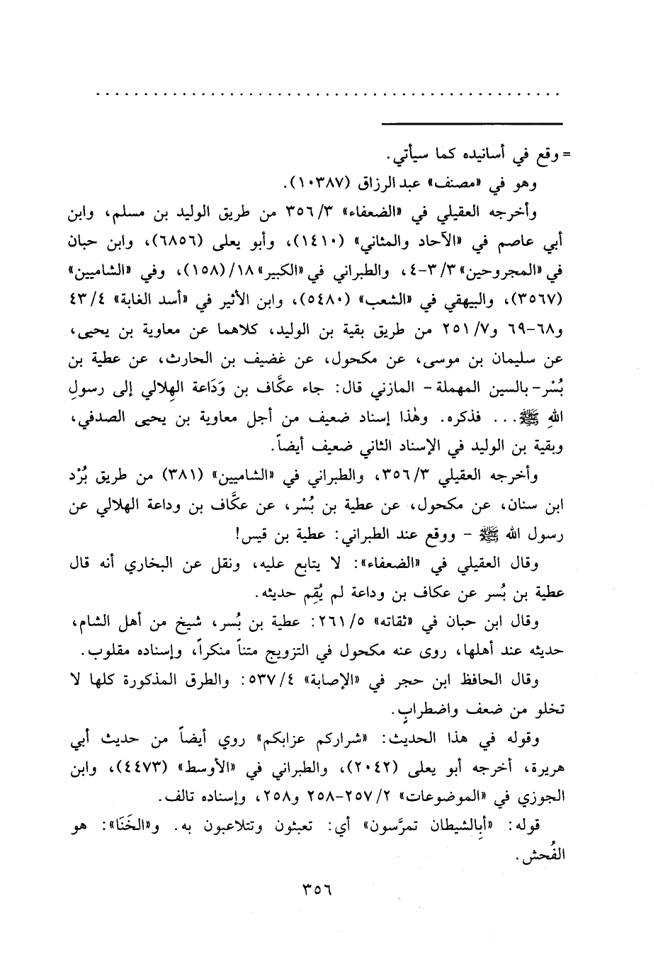 وأخرجه العقيلي ٣/٣٥٦، والطبراني في "الشاميين" (٣٨١) من طريق بُرْد ابن سنان، عن مكحول، عن عطية بن بُسْر، عن عكَّاف بن وداعة الهلالي عن رسول الله صَلَّى اللهُ عَلَيْهِ وَسَلَّمَ - ووقع عند الطبراني: عطية بن قيس!