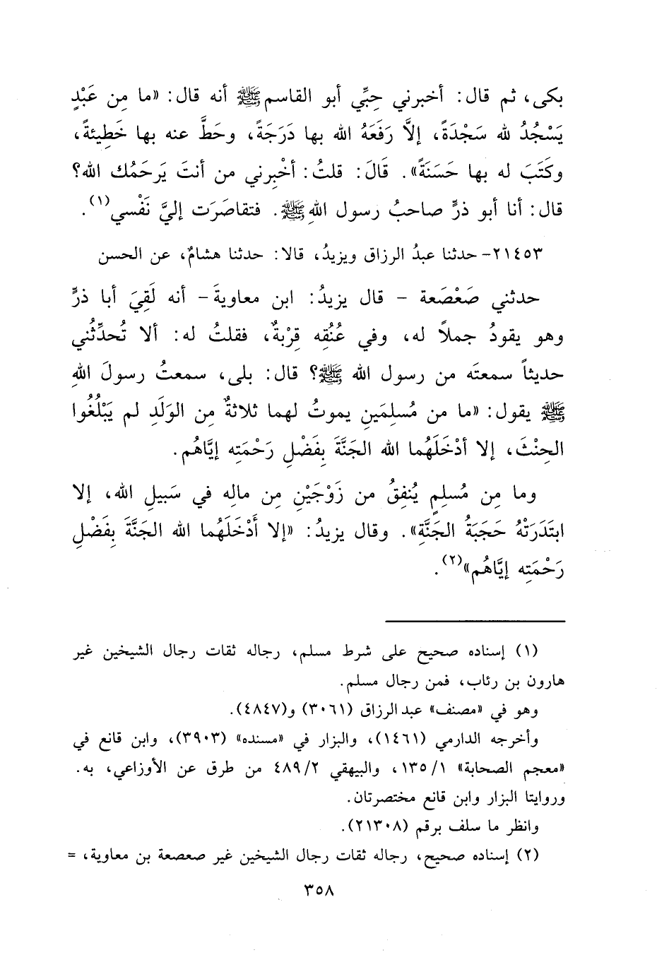 ٢١٤٥٣ - حَدَّثَنَا عَبْدُ الرَّزَّاقِ، وَيَزِيدُ، قَالَا: حَدَّثَنَا هِشَامٌ، عَنِ الْحَسَنِ، حَدَّثَنِي صَعْصَعَةُ، قَالَ يَزِيدُ: ابْنُ مُعَاوِيَةَ، أَنَّهُ لَقِيَ أَبَا ذَرٍّ، وَهُوَ يَقُودُ جَمَلًا لَهُ، وَفِي عُنُقِهِ قِرْبَةٌ، فَقُلْتُ لَهُ: أَلَا تُحَدِّثُنِي حَدِيثًا سَمِعْتَهُ مِنْ رَسُولِ اللهِ صَلَّى اللهُ عَلَيْهِ وَسَلَّمَ؟ قَالَ: بَلَى. سَمِعْتُ رَسُولَ اللهِ صَلَّى اللهُ عَلَيْهِ وَسَلَّمَ يَقُولُ: "مَا مِنْ مُسْلِمَيْنِ يَمُوتُ لَهُمَا ثَلَاثَةٌ مِنَ الْوَلَدِ لَمْ يَبْلُغُوا الْحِنْثَ، إِلَّا أَدْخَلَهُمَا اللهُ الْجَنَّةَ بِفَضْلِ رَحْمَتِهِ إِيَّاهُمْ "