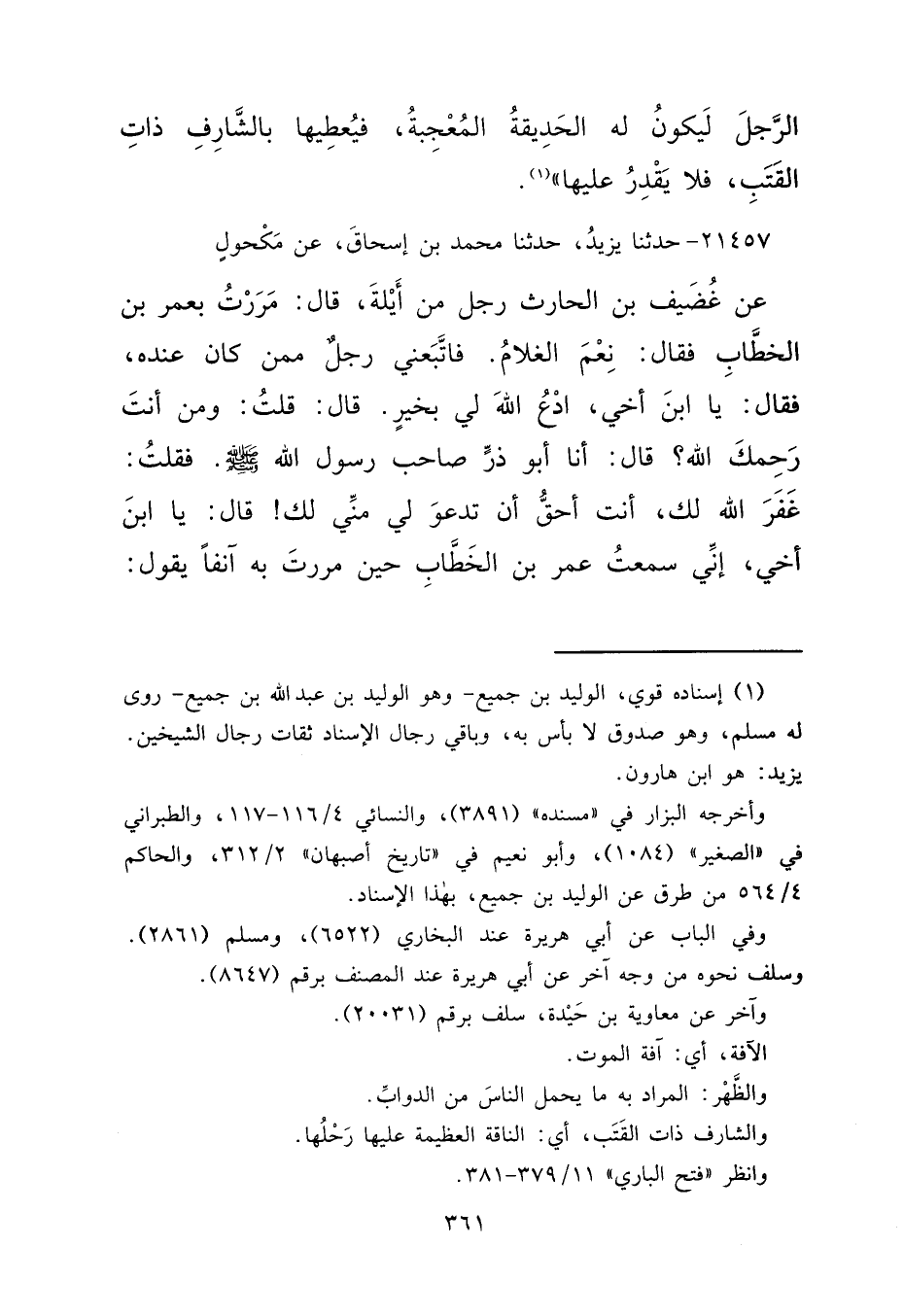 ٢١٤٥٧ - حَدَّثَنَا يَزِيدُ، حَدَّثَنَا مُحَمَّدُ بْنُ إِسْحَاقَ، عَنْ مَكْحُولٍ، عَنْ غُضَيْفِ بْنِ الْحَارِثِ، رَجُلٍ مِنْ أَيْلَةَ، قَالَ: مَرَرْتُ بِعُمَرَ بْنِ الْخَطَّابِ، فَقَالَ: نِعْمَ الْغُلَامُ. فَاتَّبَعَنِي رَجُلٌ مِمَّنْ كَانَ عِنْدَهُ، فَقَالَ: يَا ابْنَ أَخِي، ادْعُ اللهَ لِي بِخَيْرٍ. قَالَ: قُلْتُ: وَمَنْ أَنْتَ رَحِمَكَ اللهُ؟ قَالَ: أَنَا أَبُو ذَرٍّ، صَاحِبُ رَسُولِ اللهِ صَلَّى اللهُ عَلَيْهِ وَسَلَّمَ. فَقُلْتُ: غَفَرَ اللهُ لَكَ، أَنْتَ أَحَقُّ أَنْ تَدْعُوَ لِي مِنِّي لَكَ قَالَ: يَا ابْنَ أَخِي، إِنِّي سَمِعْتُ عُمَرَ بْنَ الْخَطَّابِ حِينَ مَرَرْتُ بِهِ آنِفًا يَقُولُ: