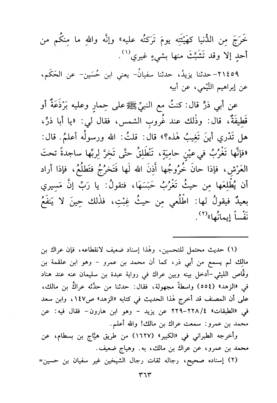 ٢١٤٥٩ - حَدَّثَنَا يَزِيدُ، حَدَّثَنَا سُفْيَانُ يَعْنِي ابْنَ حُسَيْنٍ، عَنِ الْحَكَمِ، عَنْ إِبْرَاهِيمَ التَّيْمِيِّ، عَنْ أَبِيهِ، عَنْ أَبِي ذَرٍّ، قَالَ: كُنْتُ مَعَ النَّبِيِّ صَلَّى اللهُ عَلَيْهِ وَسَلَّمَ عَلَى حِمَارٍ وَعَلَيْهِ بَرْذَعَةٌ أَوْ قَطِيفَةٌ، قَالَ: وَذَلِكَ عِنْدَ غُرُوبِ الشَّمْسِ، فَقَالَ لِي: "يَا أَبَا ذَرٍّ، هَلْ تَدْرِي أَيْنَ تَغِيبُ هَذِهِ؟ " قَالَ: قُلْتُ: اللهُ وَرَسُولُهُ أَعْلَمُ. قَالَ: "فَإِنَّهَا تَغْرُبُ فِي عَيْنٍ حَامِئَةٍ، تَنْطَلِقُ حَتَّى تَخِرَّ لِرَبِّهَا سَاجِدَةً تَحْتَ الْعَرْشِ، فَإِذَا حَانَ خُرُوجُهَا أَذِنَ اللهُ لَهَا فَتَخْرُجُ فَتَطْلُعُ، فَإِذَا أَرَادَ أَنْ يُطْلِعَهَا مِنْ حَيْثُ تَغْرُبُ حَبَسَهَا، فَتَقُولُ: يَا رَبِّ إِنَّ مَسِيرِي بَعِيدٌ فَيَقُولُ لَهَا: اطْلُعِي مِنْ حَيْثُ غِبْتِ، فَذَلِكَ حِينَ لَا يَنْفَعُ نَفْسًا إِيمَانُهَا " (٢)