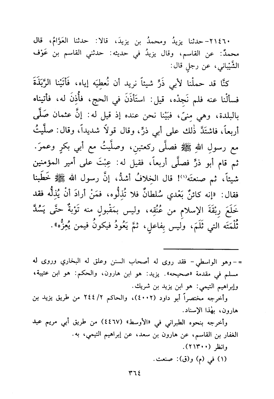 ٢١٤٦٠ - حَدَّثَنَا يَزِيدُ، وَمُحَمَّدُ بْنُ يَزِيدَ، قَالَا: حَدَّثَنَا الْعَوَّامُ، قَالَ مُحَمَّدٌ: عَنِ الْقَاسِمِ، وَقَالَ يَزِيدُ فِي حَدِيثِهِ: حَدَّثَنِي الْقَاسِمُ بْنُ عَوْفٍ الشَّيْبَانِيُّ، عَنْ رَجُلٍ، قَالَ: كُنَّا قَدْ حَمَلْنَا لِأَبِي ذَرٍّ، شَيْئًا نُرِيدُ أَنْ نُعْطِيَهُ إِيَّاهُ، فَأَتَيْنَا الرَّبَذَةَ فَسَأَلْنَا عَنْهُ فَلَمْ نَجِدْهُ، قِيلَ: اسْتَأْذَنَ فِي الْحَجِّ، فَأُذِنَ لَهُ، فَأَتَيْنَاهُ بِالْبَلْدَةِ، وَهِيَ مِنًى، فَبَيْنَا نَحْنُ عِنْدَهُ إِذْ قِيلَ لَهُ: إِنَّ عُثْمَانَ صَلَّى أَرْبَعًا، فَاشْتَدَّ ذَلِكَ عَلَى أَبِي ذَرٍّ، وَقَالَ قَوْلًا شَدِيدًا، وَقَالَ: صَلَّيْتُ مَعَ رَسُولِ اللهِ صَلَّى اللهُ عَلَيْهِ وَسَلَّمَ فَصَلَّى رَكْعَتَيْنِ، وَصَلَّيْتُ مَعَ أَبِي بَكْرٍ وَعُمَرَ. ثُمَّ قَامَ أَبُو ذَرٍّ فَصَلَّى أَرْبَعًا، فَقِيلَ لَهُ: عِبْتَ عَلَى أَمِيرِ الْمُؤْمِنِينَ شَيْئًا، ثُمَّ صنعتَه (١) قَالَ: الْخِلَافُ أَشَدُّ، إِنَّ رَسُولَ اللهِ صَلَّى اللهُ عَلَيْهِ وَسَلَّمَ خَطَبَنَا فَقَالَ: "إِنَّهُ كَائِنٌ بَعْدِي سُلْطَانٌ فَلَا تُذِلُّوهُ، فَمَنْ أَرَادَ أَنْ يُذِلَّهُ فَقَدْ خَلَعَ رِبْقَةَ الْإِسْلَامِ مِنْ عُنُقِهِ، وَلَيْسَ بِمَقْبُولٍ مِنْهُ تَوْبَةٌ حَتَّى يَسُدَّ ثُلْمَتَهُ الَّتِي ثَلَمَ، وَلَيْسَ بِفَاعِلٍ، ثُمَّ يَعُودُ فَيَكُونُ فِيمَنْ يُعِزُّهُ ".