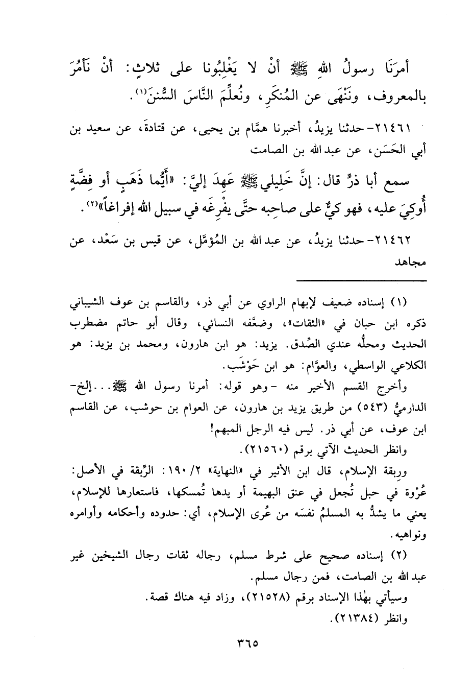 ٢١٤٦١ - حَدَّثَنَا يَزِيدُ، أَخْبَرَنَا هَمَّامُ بْنُ يَحْيَى، عَنْ قَتَادَةَ، عَنْ سَعِيدِ بْنِ أَبِي الْحَسَنِ، عَنْ عَبْدِ اللهِ بْنِ الصَّامِتِ، سَمِعَ أَبَا ذَرٍّ، قَالَ: إِنَّ خَلِيلِي صَلَّى اللهُ عَلَيْهِ وَسَلَّمَ عَهِدَ إِلَيَّ: "أَيُّمَا ذَهَبٍ أَوْ فِضَّةٍ أُوكِيَ عَلَيْهِ، فَهُوَ كَيٌّ عَلَى صَاحِبِهِ حَتَّى يُفْرِغَهُ فِي سَبِيلِ اللهِ إِفْرَاغًا " (٢)