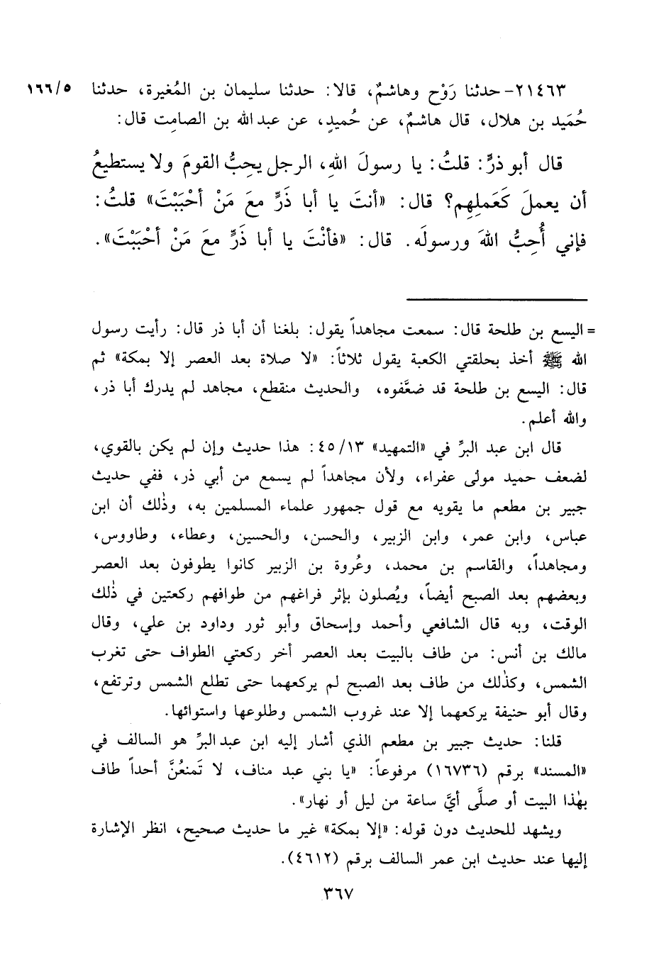 قال ابن عبد البرِّ في "التمهيد" ١٣/٤٥: هذا حديث وإن لم يكن بالقوي، لضعف حميد مولى عفراء، ولأن مجاهداً لم يسمع من أبي ذر، ففي حديث جبير بن مطعم ما يقويه مع قول جمهور علماء المسلمين به، وذلك أن ابن عباس، وابن عمر، وابن الزبير، والحسن، والحسين، وعطاء، وطاووس، ومجاهداً، والقاسم بن محمد، وعُروة بن الزبير كانوا يطوفون بعد العصر وبعضهم بعد الصبح أيضاً، ويُصلون بإثر فراغهم من طوافهم ركعتين في ذلك الوقت، وبه قال الشافعي وأحمد وإسحاق وأبو ثور وداود بن علي، وقال مالك بن أنس: من طاف بالبيت بعد العصر أخر ركعتي الطواف حتى تغرب الشمس، وكذلك من طاف بعد الصبح لم يركعهما حتى تطلع الشمس وترتفع، وقال أبو حنيفة يركعهما إلا عند غروب الشمس وطلوعها واستوائها.