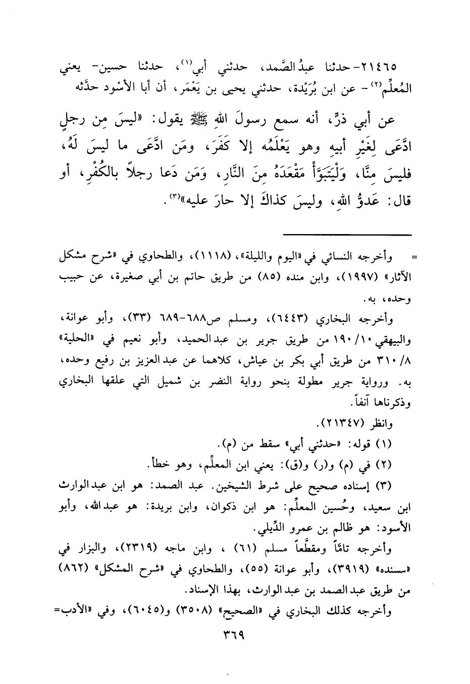 ٢١٤٦٥ - حَدَّثَنَا عَبْدُ الصَّمَدِ، حَدَّثَنَا أَبِي (١) ، حَدَّثَنَا حُسَيْنٌ يَعْنِي الْمُعَلِّمَ (٢) ، عَنِ ابْنِ بُرَيْدَةَ، حَدَّثَنِي يَحْيَى بْنُ يَعْمَرَ، أَنَّ أَبَا الْأَسْوَدِ، حَدَّثَهُ عَنْ أَبِي ذَرٍّ، أَنَّهُ سَمِعَ رَسُولَ اللهِ صَلَّى اللهُ عَلَيْهِ وَسَلَّمَ يَقُولُ: "لَيْسَ مِنْ رَجُلٍ ادَّعَى لِغَيْرِ أَبِيهِ، وَهُوَ يَعْلَمُهُ إِلَّا كَفَرَ، وَمَنْ ادَّعَى مَا لَيْسَ لَهُ، فَلَيْسَ مِنَّا، وَلْيَتَبَوَّأْ مَقْعَدَهُ مِنَ النَّارِ، وَمَنْ دَعَا رَجُلًا بِالْكُفْرِ، أَوْ قَالَ: عَدُوُّ اللهِ، وَلَيْسَ كَذَاكَ إِلَّا حَارَ عَلَيْهِ " (٣)