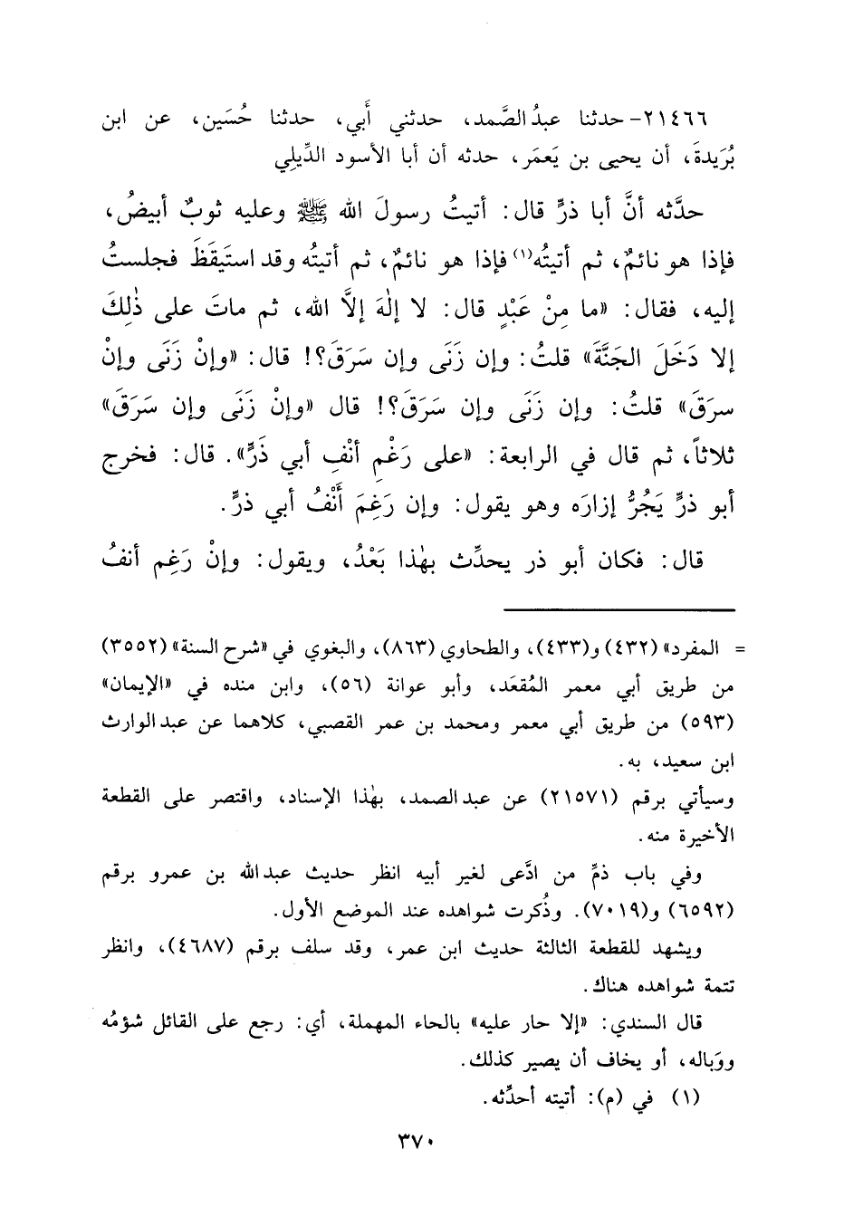 ٢١٤٦٦ - حَدَّثَنَا عَبْدُ الصَّمَدِ، حَدَّثَنِي أَبِي، حَدَّثَنَا حُسَيْنٌ، عَنِ ابْنِ بُرَيْدَةَ، أَنَّ يَحْيَى بْنَ يَعْمَرَ، حَدَّثَهُ أَنَّ أَبَا الْأَسْوَدِ الدِّيلِيَّ، حَدَّثَهُ أَنَّ أَبَا ذَرٍّ، قَالَ: أَتَيْتُ رَسُولَ اللهِ صَلَّى اللهُ عَلَيْهِ وَسَلَّمَ وَعَلَيْهِ ثَوْبٌ أَبْيَضُ، فَإِذَا هُوَ نَائِمٌ، ثُمَّ أتيتُه (١) فَإِذَا هُوَ نَائِمٌ، ثُمَّ أَتَيْتُهُ وَقَدْ اسْتَيْقَظَ فَجَلَسْتُ إِلَيْهِ، فَقَالَ: "مَا مِنْ عَبْدٍ قَالَ: لَا إِلَهَ إِلَّا اللهُ، ثُمَّ مَاتَ عَلَى ذَلِكَ إِلَّا دَخَلَ الْجَنَّةَ " قُلْتُ: وَإِنْ زَنَى وَإِنْ سَرَقَ؟ قَالَ: "وَإِنْ زَنَى وَإِنْ سَرَقَ " قُلْتُ: وَإِنْ زَنَى وَإِنْ سَرَقَ؟ قَالَ: "وَإِنْ زَنَى وَإِنْ سَرَقَ " ثَلَاثًا، ثُمَّ قَالَ فِي الرَّابِعَةِ: "عَلَى رَغْمِ أَنْفِ أَبِي ذَرٍّ " قَالَ: فَخَرَجَ أَبُو ذَرٍّ يَجُرُّ إِزَارَهُ وَهُوَ يَقُولُ: "وَإِنْ رَغِمَ أَنْفُ أَبِي ذَرٍّ. قَالَ: فَكَانَ أَبُو ذَرٍّ يُحَدِّثُ بِهَذَا بَعْدُ، وَيَقُولُ: وَإِنْ رَغِمَ أَنْفُ