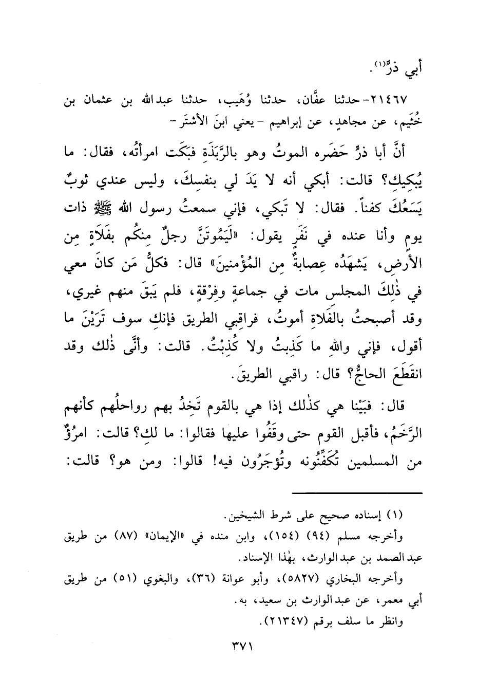 ٢١٤٦٧ - حَدَّثَنَا عَفَّانُ، حَدَّثَنَا وُهَيْبٌ، حَدَّثَنَا عَبْدُ اللهِ بْنُ عُثْمَانَ بْنِ خُثَيْمٍ، عَنْ مُجَاهِدٍ، عَنْ إِبْرَاهِيمَ يَعْنِي ابْنَ الْأَشْتَرِ، أَنَّ أَبَا ذَرٍّ، حَضَرَهُ الْمَوْتُ وَهُوَ بِالرَّبَذَةِ فَبَكَتْ امْرَأَتُهُ، فَقَالَ: مَا يُبْكِيكِ؟ قَالَتْ: أَبْكِي أَنَّهُ لَا يَدَ لِي بِنَفْسِكَ، وَلَيْسَ عِنْدِي ثَوْبٌ يَسَعُكَ كَفَنًا. فَقَالَ: لَا تَبْكِي، فَإِنِّي سَمِعْتُ رَسُولَ اللهِ صَلَّى اللهُ عَلَيْهِ وَسَلَّمَ ذَاتَ يَوْمٍ وَأَنَا عِنْدَهُ فِي نَفَرٍ يَقُولُ: "لَيَمُوتَنَّ رَجُلٌ مِنْكُمْ بِفَلَاةٍ مِنَ الْأَرْضِ، يَشْهَدُهُ عِصَابَةٌ مِنَ الْمُؤْمِنِينَ " قَالَ: فَكُلُّ مَنْ كَانَ مَعِي فِي ذَلِكَ الْمَجْلِسِ مَاتَ فِي جَمَاعَةٍ وَفُرْقَةٍ، فَلَمْ يَبْقَ مِنْهُمْ غَيْرِي، وَقَدْ أَصْبَحْتُ بِالْفَلَاةِ أَمُوتُ، فَرَاقِبِي الطَّرِيقَ فَإِنَّكِ سَوْفَ تَرَيْنَ مَا أَقُولُ، فَإِنِّي وَاللهِ مَا كَذَبْتُ وَلَا كُذِبْتُ. قَالَتْ: وَأَنَّى ذَلِكَ وَقَدْ انْقَطَعَ الْحَاجُّ؟ قَالَ: رَاقِبِي الطَّرِيقَ. قَالَ: فَبَيْنَا هِيَ كَذَلِكَ إِذَا هِيَ بِالْقَوْمِ تَخُدُّ بِهِمْ رَوَاحِلُهُمْ كَأَنَّهُمُ الرَّخَمُ، فَأَقْبَلَ الْقَوْمُ حَتَّى وَقَفُوا عَلَيْهَا فَقَالُوا: مَا لَكِ؟ قَالَتْ: امْرُؤٌ مِنَ الْمُسْلِمِينَ تُكَفِّنُونَهُ وَتُؤْجَرُونَ فِيهِ قَالُوا: وَمَنْ هُوَ؟ قَالَتْ: